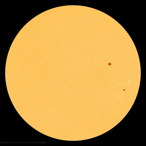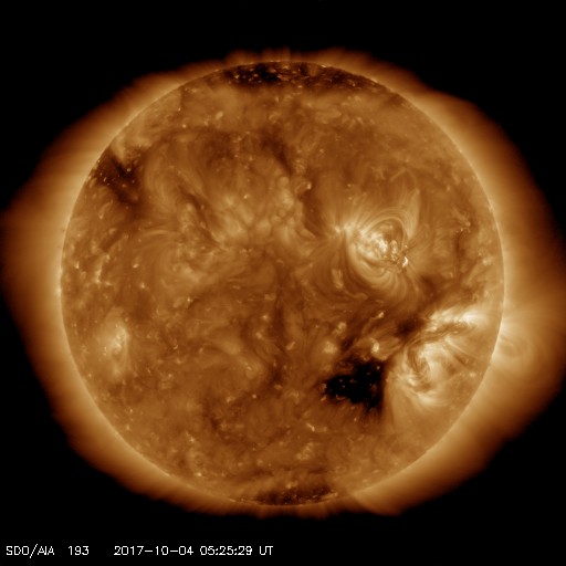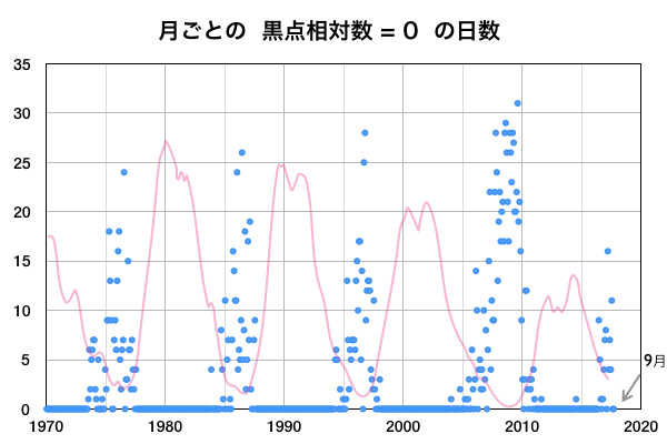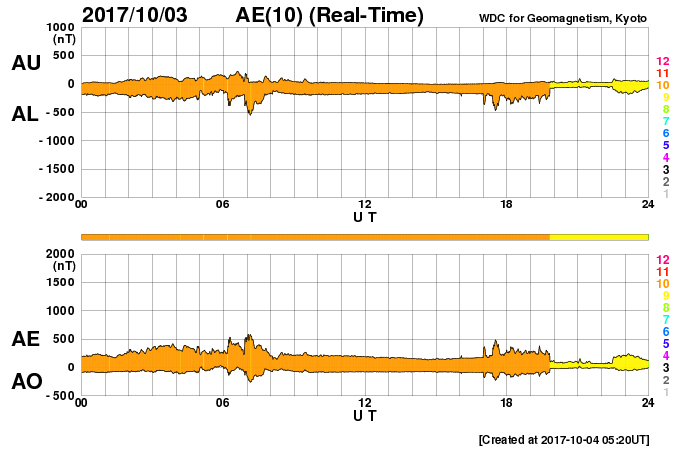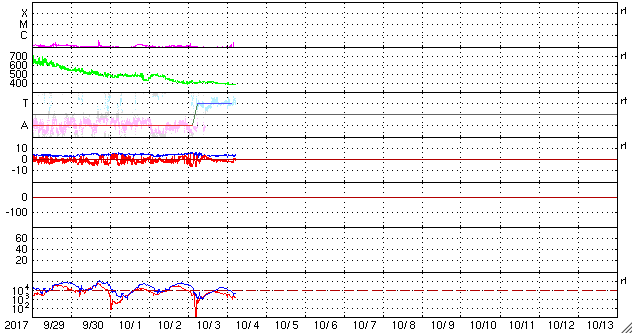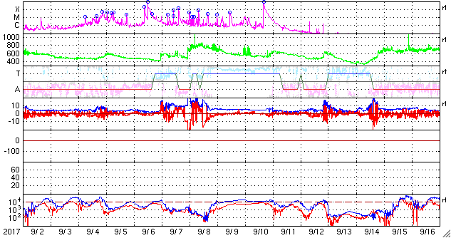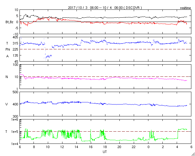 2017/10/ 4 14:31 更新 太陽風、磁気圏は穏やかです。9月の黒点相対数は、43.6 でした。 担当 篠原 6月以来の報告になってしまいましたが、 WDC-SILSOによる9月の黒点相対数は、43.6 でした。 9月初めの2673群、2674群の発達や、 黒点群が5個前後見え続けていたためでしょう。 その一方、グラフ全体の推移で見ると、 40台という数字は、1年前の2016年の水準に上がった程度で、 特別に大きな変化ではないことも分かります。 無黒点の日数は、7月に11日を記録した後、 8月、9月はどちらも0日でした。 現在も黒点群は2つ見えていますが、 今後、どのように推移するでしょうか。 太陽風は、速度が380km/秒とやや低速に向かっています。 磁場強度も、4nTと少し弱くなっています。 磁場の南北成分は、南寄りですが、小さく変化する程度で、 磁気圏は概ね静穏です。 SDO衛星AIA193では、 南半球のコロナホールが西半球に進んでいます。 明日くらいから影響が始まるかもしれません。 太陽は、X線グラフの変化はなく、 穏やかな状態が続いています。