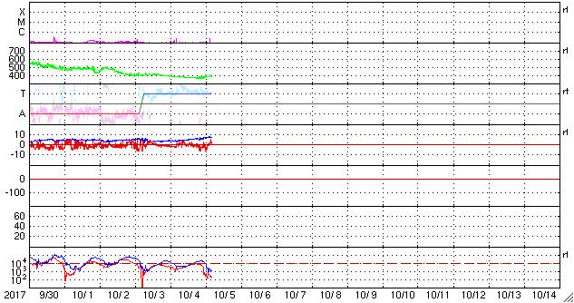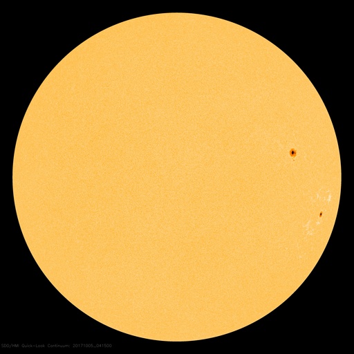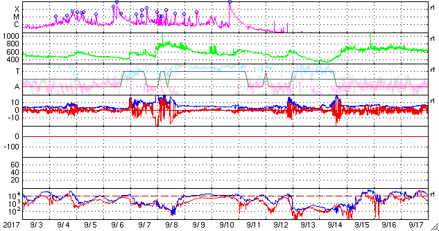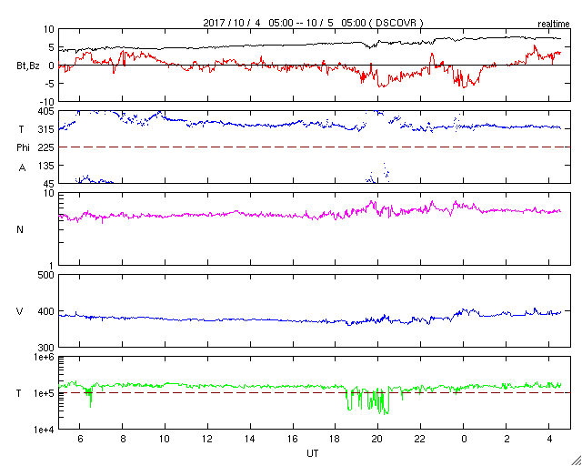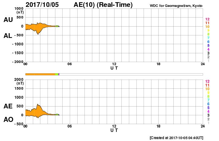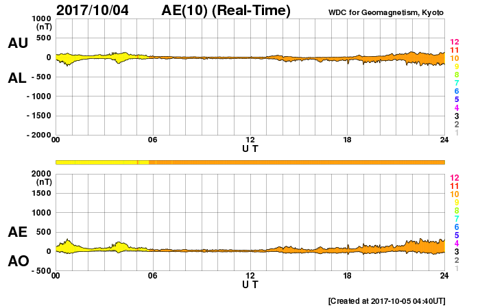2017/10/ 5 13:42 更新 太陽風は平均的な速度ですが、高速風が近づいているかもしれません。アイスランドのオーロラをどうぞ。 担当 篠原 高坂雄一さんより、アイスランドで撮影されたオーロラの写真をいただきました。 アイスランドの南東部の Glacier Lagoon, ヨークルスアゥルロゥン ( Jökulsárlón ) の撮影です。 高坂さんによると、アイスランドに来て5晩めにして ようやく動きのあるオーロラが撮れたとのことです。 10月に入った頃から太陽風が落ち着いて、 オーロラの活動度が下がるタイミングに当たってしまったようです。 また、アイスランドは曇りや雨が多いそうで、天候の難しさもあるそうです。 Wikipediaによると、ここは氷河の先端の湖で、大西洋に面しています。 独特の地上の風景と上空のオーロラ、湖面に映るオーロラの輝きと、 とても素敵な雰囲気です。 満月直前の明るい頃というタイミングも、この写真の特徴だと思います。 4枚目の写真は、1日前の2日の夜の撮影で、 南部スコゥガル (Skógar) のスコゥガフォス滝 (Skógafoss Waterfall)で、 月虹が見えていたそうです。 Wikipediaによると、落差60mのアイスランド最大級の滝だそうです。 北斗七星が、余裕を持って崖の上を下方通過しています。 難しい撮影条件の中での美しい写真をありがとうございます。 太陽風は、速度は390km/秒と平均的な状態が続いていますが、 磁場強度は、5nTから7nTへゆっくりと強まっています。 まだはっきりとしませんが、 高速風の到来が近づいているのかもしれません。 この後も、磁場強度が更に高まっていくようだと、 続いて速度も高まっていきそうです。 磁気圏は基本的には穏やかですが、 AE指数のグラフでは、太陽風の磁場が南向きに強まった頃に、 活動の高まりが起きています。 太陽は、穏やかな状態が続いています。 2つの黒点群も、静かに太陽の西の端に近づいています。 南側の2682黒点群は、前周期の今頃は(27日周期の図を参照)、 Xフレアを起こすなど活発に活動していました。 今回は完全に静かになっています。