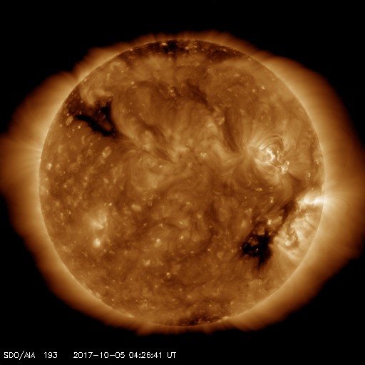 (c) 高坂雄一氏 ![]() アイスランド南東部のヨークルスアゥルロゥンで10月3日夜に撮影されたオーロラ。 (c) 高坂雄一氏 ![]() アイスランド南東部のヨークルスアゥルロゥンで10月3日夜に撮影されたオーロラ。 (c) 高坂雄一氏 ![]() アイスランド南部のスコゥガルで10月2日夜に撮影された月虹。 (c) 高坂雄一氏 ![]() SDO衛星のAIA193カメラによる太陽コロナの様子 (c) SDO (NASA) ![]() SDO衛星による太陽の可視光写真。マウスの矢印を写真に重ねると、黒点番号付きの写真に切り替わります。 (c) SDO (NASA) ![]() DSCOVRが観測した太陽風の磁場(1番上の枠、黒線は全体の強度、赤線は南北成分) および、太陽風の密度(3番目の紫線)、速度(4番目の青線) (c) データ:NOAA/SWPC、作図:宇宙天気ニュース ![]() AE指数(速報値) 下段のAEグラフの値が高くなると、オーロラ活動が活発化しています。 (c) 京都大学WDC ![]() ![]() 27日の太陽周期に合わせたデータプロット 太陽が同じ面を地球に向けていた27日前の変化から、今後を予想することができます。 (c) 作図:宇宙天気ニュース