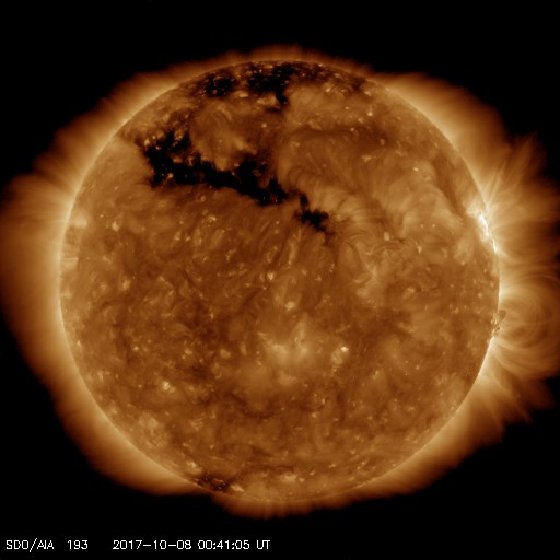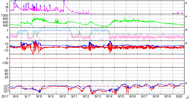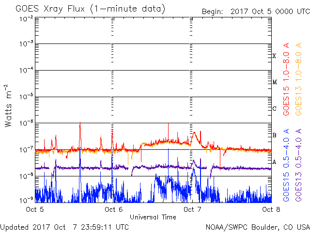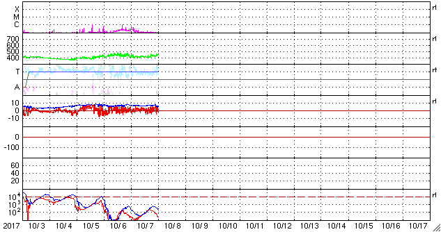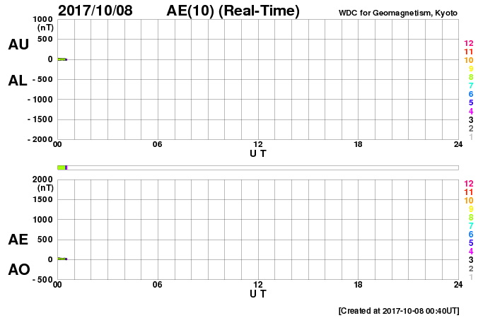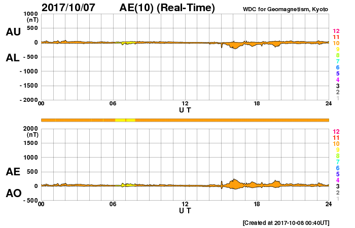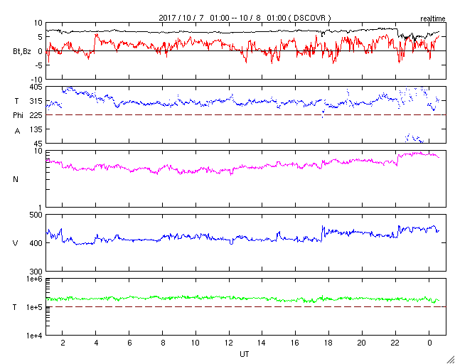 2017/10/ 8 09:50 更新 太陽風は平均的な状態で、磁気圏も静穏です。アイスランドのオーロラをどうぞ。 担当 篠原 アイスランドに滞在中の高坂雄一さんより、 現地5日夜に撮影されたオーロラの写真をいただきました。 今回は、アイスランド西側の内陸にある、グトルフォス(Gullfoss)の滝です。 高坂さんによると、神聖な滝だそうで、 Wikipediaでは「黄金の滝」という名前にあたるそうです。 この夜もオーロラは薄かったそうですが、 写真では、滝とともにかなり迫力のある光景になっています。 3枚目は月虹も写っています。 この写真の上空に、横に二列に並んで見える星たちは、 おおぐま座の後ろ足が北極星の下側を通過しているところです。 高緯度地域ならではの光景で、私のいる九州では見ることができません。 高坂さんは、滝の水しぶきで全身ずぶ濡れの撮影だったそうで、 気温は零下で、ジャケットが凍って大変だったそうです。 迫力の写真たちをありがとうございます。 太陽風は、400km/秒から450km/秒に少し速度が上がっています。 磁場強度は、7nTから5nTに少し下がっています。 太陽風の磁場の方向が切り替わる、 セクター境界を迎えているのかもしれません。 変化としてはどちらも小幅で、太陽風は平均的な状態を保っています。 磁場の南北成分は、変化は小さく、 やや北寄りになっているようです。 磁気圏は穏やかで、AE指数は小さい変化が時々見られる程度です。 SDO衛星AIA193では、 北半球の中緯度のコロナホールが太陽の中心線に見えています。 2〜3日後くらいから、太陽風の変化が始まりそうです。 太陽は、2683黒点群が西の端に近づいて、 この後、無黒点になりそうです。 X線グラフも変化はありません。