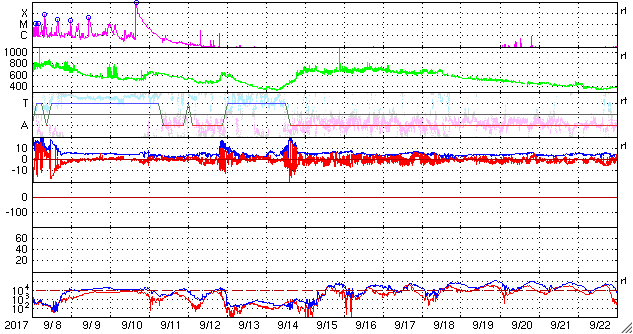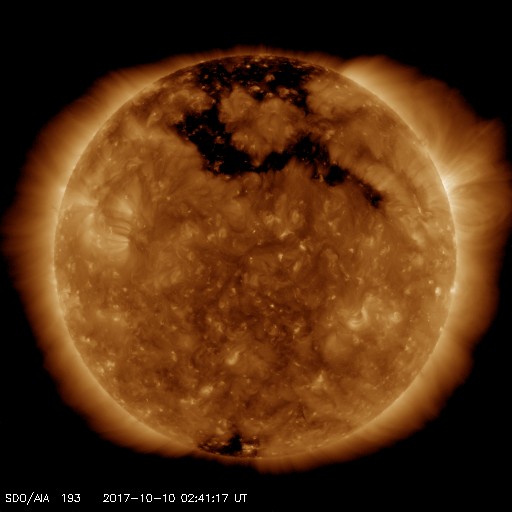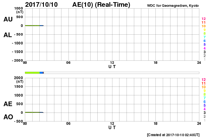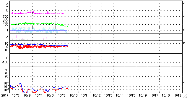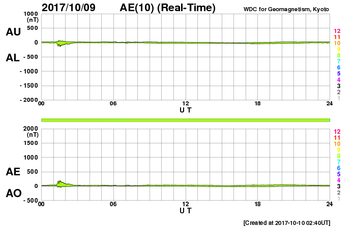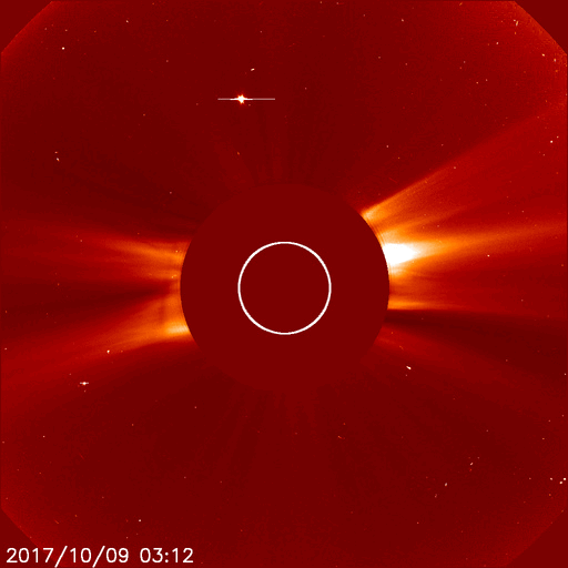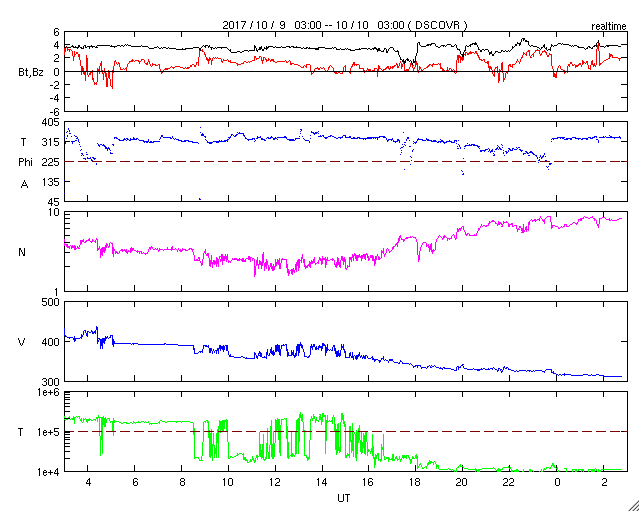 2017/10/10 11:56 更新 太陽風は低速になり、磁気圏はとても穏やかです。太陽は無黒点です。 担当 篠原 太陽風の速度は、400km/秒から300km/秒へ ゆっくりと低下しています。 平均的な状態から、低速の風に変化しています。 磁場強度は、4nT前後で安定しています。 南北成分は、全体的に北寄りになっています。 このため、磁気圏はとても静かで、 AE指数のグラフは、変化のない状態です。 SDO衛星AIA193では、コロナホールは西に進み、 地球に影響が及び始める目安の位置に達しています。 現在は、低速の穏やかな太陽風が流れていますが、 この後、磁場強度が強まる変化が始まれば、 高速風の到来となるでしょう。 太陽は、無黒点の状態で、 こちら側は穏やかです。 一方、太陽の向こう側では、 西に沈んで見えなくなった2683群付近で、 フレアかフィラメント噴出が起きたようで、 太陽の西に向かってCME(太陽ガスの放出現象)が発生しています。 SOHO衛星LASCO C2、C3の動画を紹介します。 地球への影響はありません。 この動画の左上に見える明るい星は、 太陽の向こう側を通過している水星です。