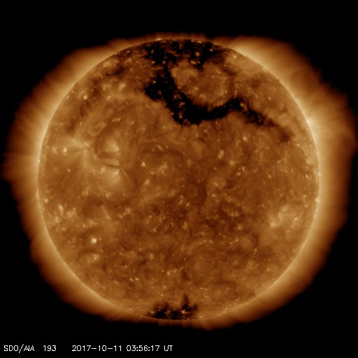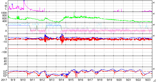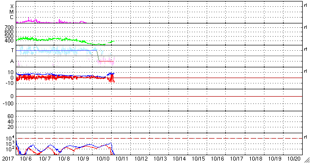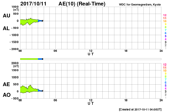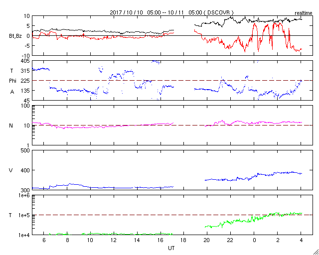 2017/10/11 13:11 更新 太陽風が少し強まり、高速風が始まりそうです。新燃岳が6年ぶりに噴火しました。 担当 篠原 宇宙天気の話題ではありませんが、 今朝早く、霧島山の新燃岳が6年ぶりに噴火を起こしました。 鹿児島高専は霧島山の南にあり、 学校の窓から新燃岳を見ることができます。 噴火のニュースに気付いた直後に校舎から撮影した写真を掲載します。 今日は空の透明度が悪く、霞んでしまっていたので、 写真はかなり強調処理をしています。 噴煙が高度300mほどに達し、小規模の噴火が起きたとの報道ですが、 実際に見ると、数字以上の迫力を感じます。 風下側は、かなりの降灰になっているのではないでしょうか。 前回の2011年の噴火の時は、1月27日と、1月28日に、 噴火の様子を紹介しました。 今回も引き続き注意が必要とのことです。 太陽風は、磁場強度が8nTにやや強まり、 速度は400km/秒と平均的な速さに上がっています。 コロナホールの影響が及び始めたのかもしれません。 この後、どこまで高まって行くか、変化に注目して下さい。 太陽風磁場の南北成分は、 磁場強度の強まりとともに南向きに大きく振れるようになり、 -5nTを越える変化が続いています。 太陽風の速度が遅かったので、磁気圏への影響は限定的ですが、 AE指数は、500nT近い変化が続くようになっています。 今後、太陽風が強まると、磁気圏への影響もより大きくなるでしょう。 SDO衛星AIA193では、 コロナホールは太陽の中心線を越えて北極へ向かって伸びています。 これから5日程度にわたって、影響が続きそうです。 太陽は、今日も無黒点です。 X線のグラフも変化はなく、とても穏やかです。 ![]() 6年ぶりに噴火を起こした霧島山新燃岳。10月11日8時半撮影。 (c) 篠原 学 ![]() 6年ぶりに噴火を起こした霧島山新燃岳。10月11日8時半撮影。 (c) 篠原 学 ![]() SDO衛星のAIA193カメラによる太陽コロナの様子 (c) SDO (NASA) ![]() SDO衛星による太陽の可視光写真 (c) SDO (NASA) ![]() DSCOVRが観測した太陽風の磁場(1番上の枠、黒線は全体の強度、赤線は南北成分) および、太陽風の密度(3番目の紫線)、速度(4番目の青線) (c) データ:NOAA/SWPC、作図:宇宙天気ニュース ![]() AE指数(速報値) 下段のAEグラフの値が高くなると、オーロラ活動が活発化しています。 (c) 京都大学WDC ![]() ![]() 27日の太陽周期に合わせたデータプロット 太陽が同じ面を地球に向けていた27日前の変化から、今後を予想することができます。 (c) 作図:宇宙天気ニュース