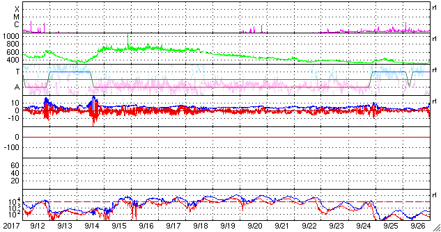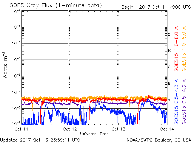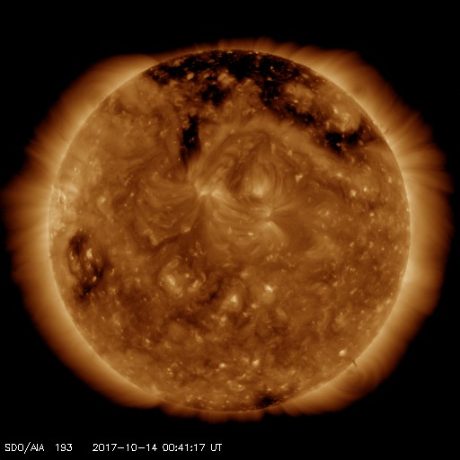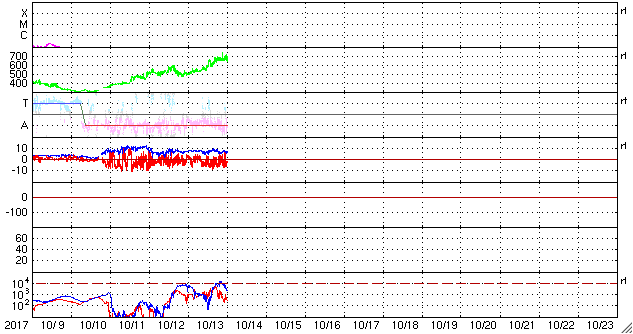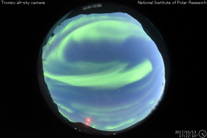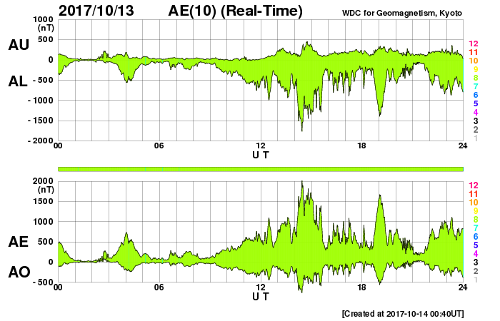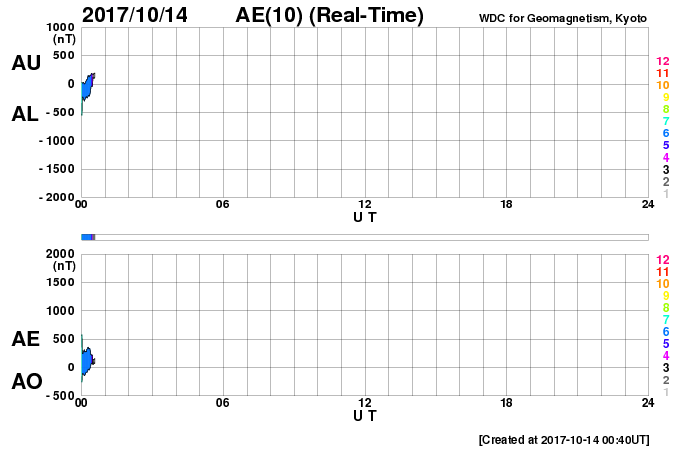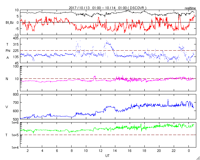 2017/10/14 09:51 更新 太陽風の速度は700km/秒に高まっています。磁気圏の活動も激しくなっています。 担当 篠原 昨日のニュース以降、 太陽風の速度は550km/秒に再び上がりました。 半日ほどこの状態が続いた後、 13日22時(世界時13日12時)頃から、 太陽風の速度は更に上昇して、650km/秒まで高まりました。 そして、現在は700km/秒に達しようとしています。 27日周期の図を見ると、 前周期も同じ頃に高速太陽風が来ていましたが、 この時は、到来後すぐに700km/秒の最高速度まで上がっていました。 今回は、だらだらと3日ほどかけて700km/秒まで上がっています。 高速風の後半の推移がどうなるか、今後の変化に注目して下さい。 太陽風の磁場強度は、7〜8nTにやや強まった状態が続いています。 このため、太陽風の速度は、 現在の高まった状態がしばらく続くかもしれません。 磁場の南北成分は、-5nT程度の南向きの状態が続いています。 速度の上昇と重なって、磁気圏の活動はかなり激しくなっています。 AE指数のグラフは、1000nTに達する変化が連続し、 2000nTや1500nTに達する大きな活動も起きています。 世界時13日17時半から20時にかけて、 ノルウェーのトロムソで撮影されたオーロラの動画を掲載します。 AE指数で、1500nTの変化が発生した頃の様子です。 時間を長めに作ったので、ファイルサイズが大きくなっています。 動画が表示されるまで少し時間がかかるかもしれません。 太陽は、無黒点の状態が続いています。 X線のグラフは全体の強度も下がって、太陽は穏やかです。 放射線帯の高エネルギー電子は、 GOES-15(青線)が10,000に達しています。 太陽風が一段と強まっているので、放射線帯も更に強まりそうです。