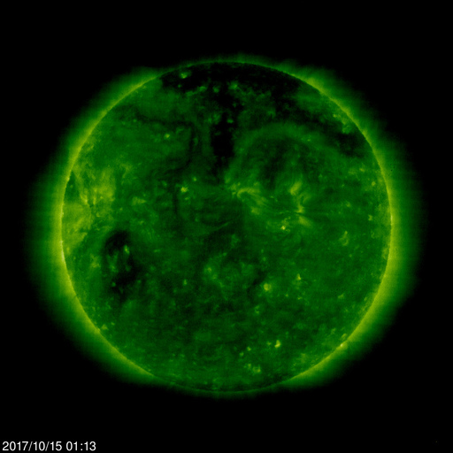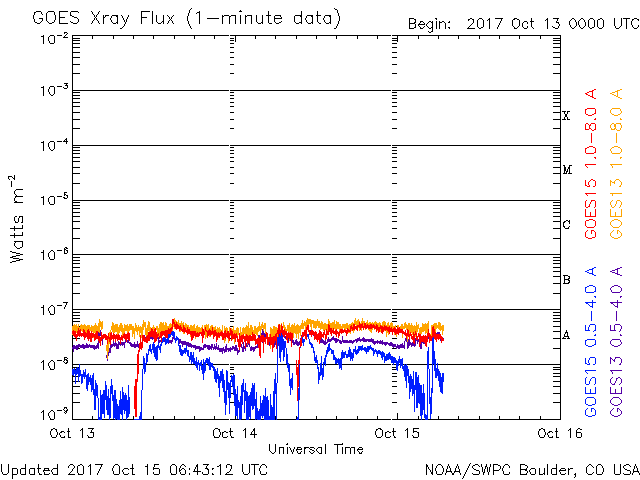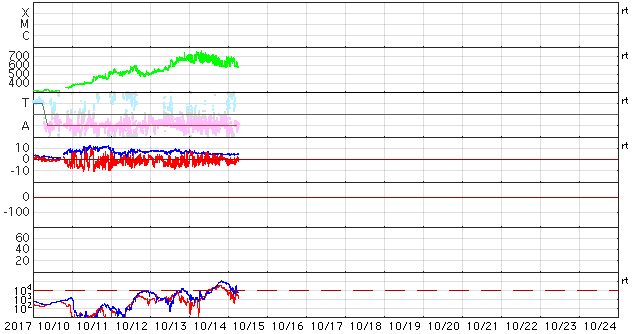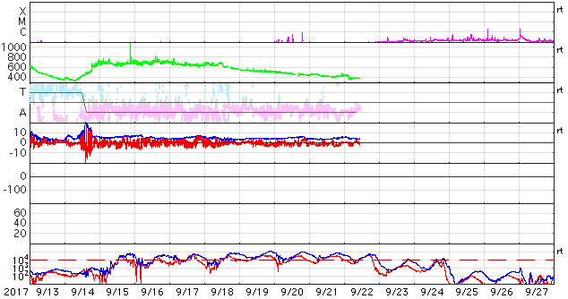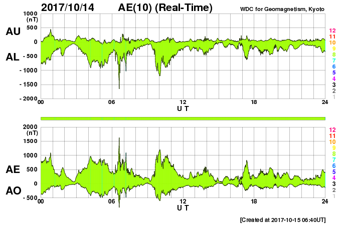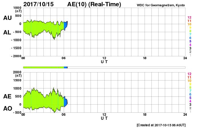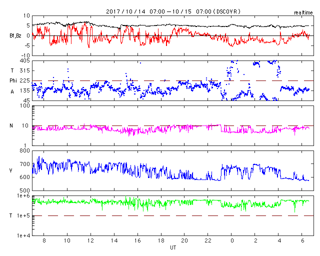 2017/10/15 15:43 更新 高速の太陽風が続き、磁気圏も活動的です。(ネットワーク障害で繋がらなくなっていました) 担当 篠原 太陽風の速度は、700km/秒から600km/秒へ少し下がっていますが、 現在も高い速度の太陽風が続いています。 磁場強度は、5nTへ少し下がり、平均的な値で安定しています。 磁場の南北成分は、南に向いたり、北に向いたりしています。 速度が高まっているため、磁場が南に向いた時は、 磁気圏の活動も激しくなり、 AE指数は、1000nTに達する活発な変化が度々発生しています。 今日は、SDO衛星のデータを参照できなかったので、 SOHO衛星のEIT195を掲載しています。 北半球のコロナホールは西に進み、 地球への影響は次第に弱まっていきます。 高速の太陽風がどこまで継続するか、 引き続き注目してください。 太陽は、無黒点の状態が続いています。 X線グラフも目立った変化はありません。 放射線帯の高エネルギー電子は、大きく上昇し、 青線のGOES15は10万の線に達しています。 GOES13(赤線)も、10,000を超えています。 太陽風の高まりが続いているので、更に増加するかもしれません。 今日の未明から、学校のネットワークに障害が発生して、 どこにも繋がらない状態になっています。 昨日から学生引率のため学外に出かけていたので、 対応が今日の午後になってしまいました。 臨時で外部サーバーを立ち上げています。 半日以上にわたって音信不通になり、申し訳ありませんでした。