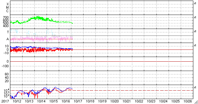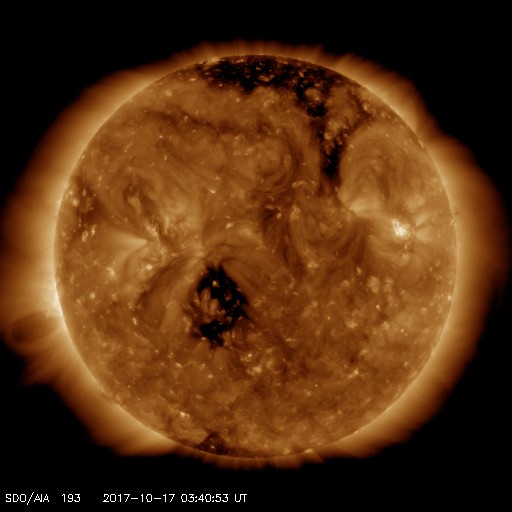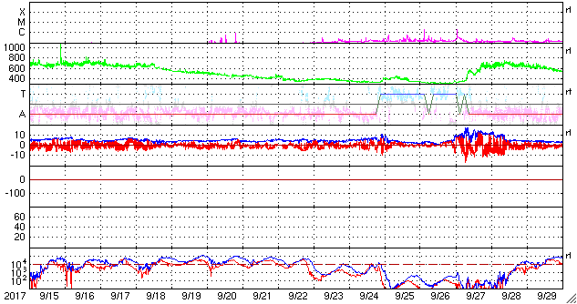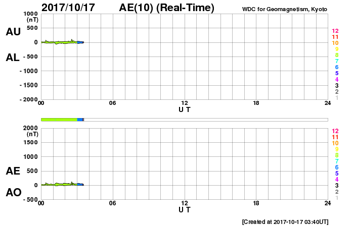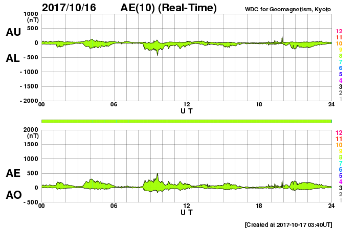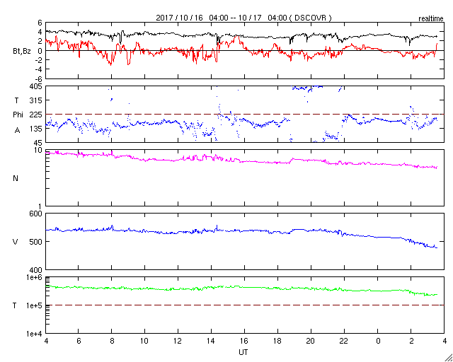 2017/10/17 12:47 更新 高速太陽風は終わりに近づいています。ムルマンスクのオーロラをどうぞ。 担当 篠原 ロシア・ムルマンスクの福島留美さんより、 9月にムルマンスク州で撮影されたオーロラの写真をいただきました。 初めの2枚は、Xフレアに伴う太陽風の乱れが吹き荒れていた頃の撮影、 次の3枚は、コロナホールによる高速太陽風の影響で オーロラが強まっていた頃の写真です。 9月は全体的に活発だったため、 福島さんの手許にはものすごい枚数のオーロラ写真が集まったそうです。 その中の厳選5枚をご覧下さい。 撮影者の名前に付け加えている説明は、福島さんからのひと言コメントです。 それぞれ撮影者が異なるので、色合いや雰囲気の違いがいつも楽しみです。 4枚目は、雲海の上にオーロラが輝いています。 背景の星に目を向けると、右端に夏の星座のいるか座があり、 中央に秋の星座たちを挟んで、左端に冬の星座のおうし座が見えています。 5枚目は、人と組み合わせた撮影が見事ですね。 空の広さと比較することができるので、景色として実感が湧きます。 きれいな写真たちをありがとうございます。 太陽風は、昨日一杯は540km/秒で安定していましたが、 今朝早くから下がり始め、現在は480km/秒と、 500km/秒台を割っています。 高速太陽風は、終わりに近づいているようです。 太陽風の磁場強度も、4nTから3nTへ更に下がっています。 磁場の南北成分は、振れ幅が小さくなっています。 変化は南北に向いているのですが、 変化が小さいため磁気圏への影響は小さくなり、 AE指数のグラフは、200〜300nTの小さい変化ばかりになっています。 昨日の図では、1000nTが続いていたので、一気に小さくなった印象です。 SDO衛星AIA193では、北半球のコロナホールは西に過ぎていますが、 南半球のコロナホールが太陽の中心線に近づいています。 この領域は、前周期は特に影響が見られなかったのですが、 今回はどうでしょうか。 3〜4日後の太陽風に注目してください。 太陽は、黒点はなく穏やかです。 ![]() 9月8日に、ロシア・ムルマンスク州で撮影されたオーロラ。 (c) 福島留美氏、アレクサンドル・ステパーネンコ氏(常連さんその1) ![]() 9月8日に、ロシア・ムルマンスク州で撮影されたオーロラ。 (c) 福島留美氏、オクサーナ・クジコーワ女史 ![]() 9月24日に、ロシア・ムルマンスク州テリベルカ村で撮影されたオーロラ。 (c) 福島留美氏、オリガ・ラケーエワ女史 ![]() 9月28日に、ロシア・ムルマンスク州アパチット市で撮影されたオーロラ。 (c) 福島留美氏、ヴァレンチン・ジガーノフ氏(常連さんその2) ![]() 9月28日に、ロシア・ムルマンスク州アパチット市で撮影されたオーロラ。 (c) 福島留美氏、ヴィタリー・イストミン氏(Jロックとサイクリングが好きな方) ![]() SDO衛星のAIA193カメラによる太陽コロナの様子 (c) SDO (NASA) ![]() SDO衛星による太陽の可視光写真 (c) SDO (NASA) ![]() DSCOVRが観測した太陽風の磁場(1番上の枠、黒線は全体の強度、赤線は南北成分) および、太陽風の密度(3番目の紫線)、速度(4番目の青線) (c) データ:NOAA/SWPC、作図:宇宙天気ニュース ![]() AE指数(速報値) 下段のAEグラフの値が高くなると、オーロラ活動が活発化しています。 (c) 京都大学WDC ![]() ![]() 27日の太陽周期に合わせたデータプロット 太陽が同じ面を地球に向けていた27日前の変化から、今後を予想することができます。 (c) 作図:宇宙天気ニュース