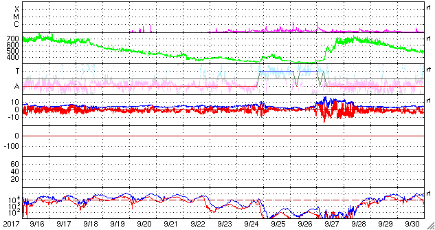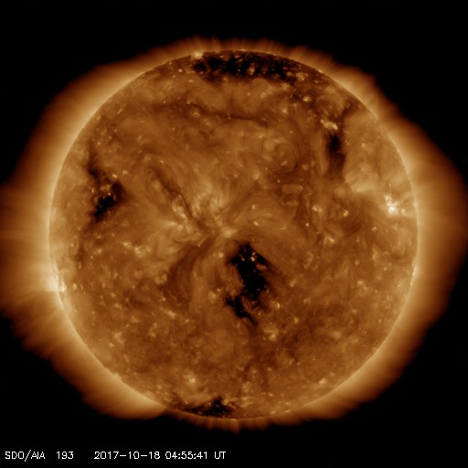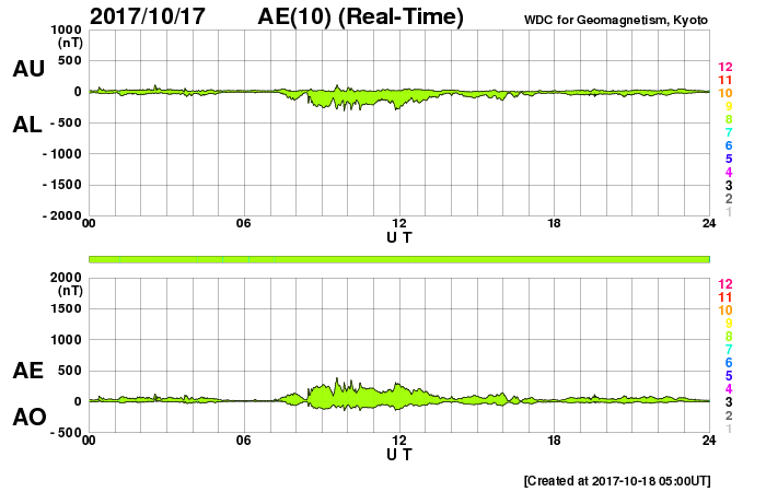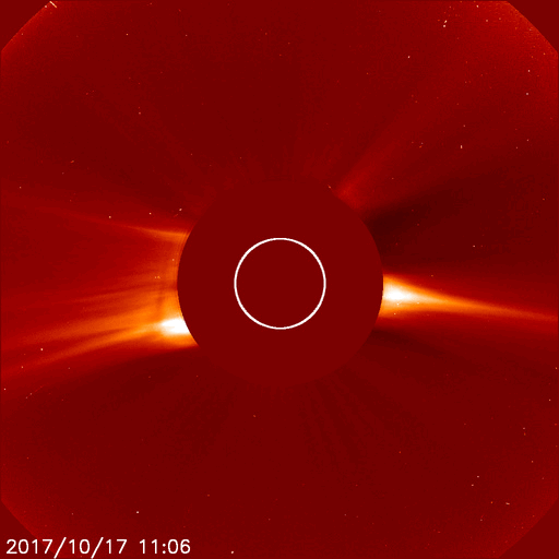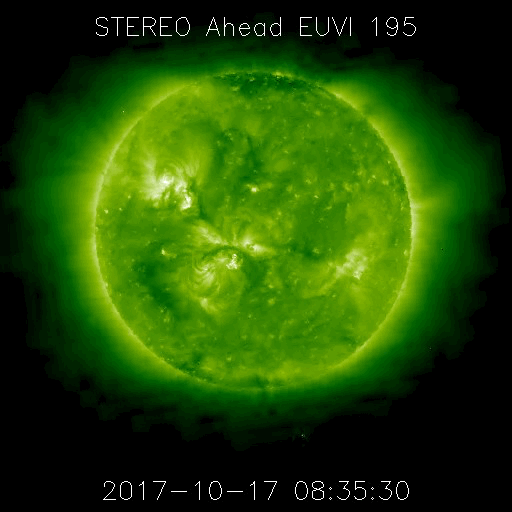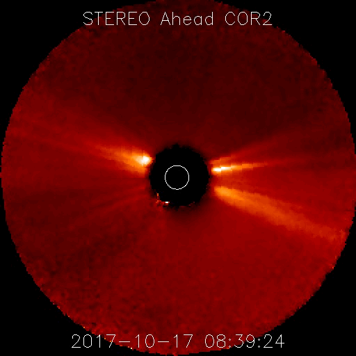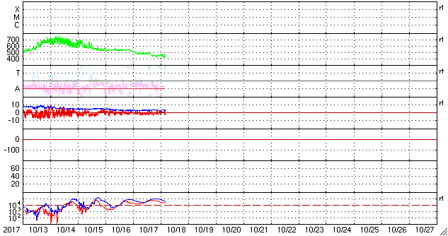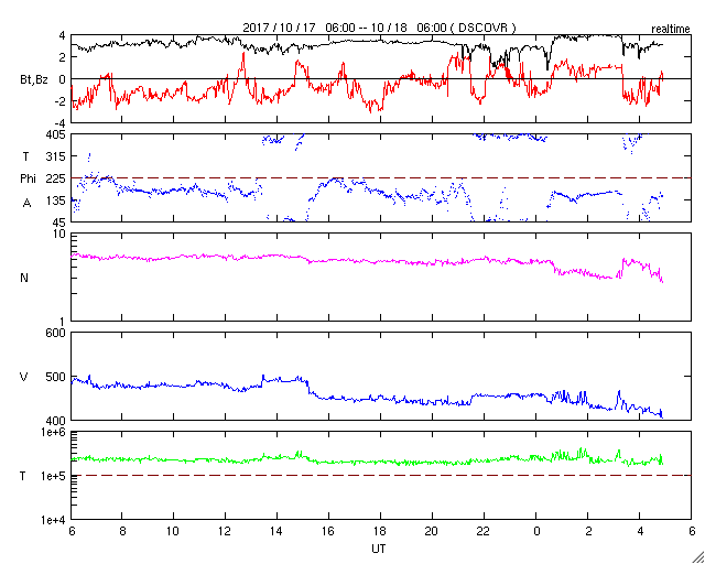 2017/10/18 14:09 更新 太陽風は平均的な速度に戻り、磁気圏も穏やかになっています。 担当 篠原 昨夜、17日22時(世界時17日13時)頃より、 太陽の東に向かって飛び出すCME(太陽ガスの放出現象)が、 SOHO衛星LASCO C2、C3により観測されました。 SDO衛星の写真では、対応する現象が見られないため、 太陽の向こう側で起きた可能性があります。 STEREO Ahead衛星のCOR2でも、 太陽の右に向かって噴出するCMEが撮影されています。 (写真が揃っていないため、動画は噴出の最初だけです) 更に、STEREO Ahead衛星のEUVI 195を見ると、 この時刻に、太陽の中心の南寄りで爆発現象が起きている様です。 ここは、9月初めにXフレアを起こした 2673黒点群が見えていた場所です。 2673群は、9月末から10月初めにかけて、 2682黒点群として太陽の地球側を通過しましたが、 この時は、目立ったフレアは起こさず、 静かに通り過ぎていきました。 このため、このまま静かに消えていくかと思ったのですが、 太陽の向こう側で再び活動を強めているのかもしれません。 2673・2682黒点群は、 10月21日頃に再びこちら側に姿を現す可能性があります。 週末にかけて、注目してください。 こちら側の太陽は、黒点は見えず、 X線グラフも変化のない、穏やかな状態が続いています。 太陽風の速度は、低下が続いて、 現在は420km/秒と平均的な状態に戻っています。 高速太陽風は、6日ほど継続して終わりを迎えました。 太陽風の磁場強度は、3nTとやや弱まった状態が続いています。 磁場の南北成分は、弱い南寄りが続いていますが、 速度が下がってきたこともあり、 磁気圏の活動は規模が小さくなっています。 AE指数では、一時的に250nTの小さい変化が見られる程度で、 その他は穏やかに推移しています。 SDO衛星AIA193では、太陽の中心部のやや南寄りに、 小ぶりのコロナホールが広がっています。 明後日くらいから、太陽風に弱い影響が見られるかもしれません。