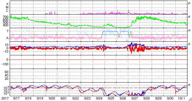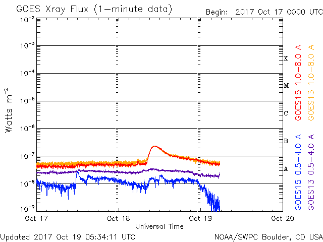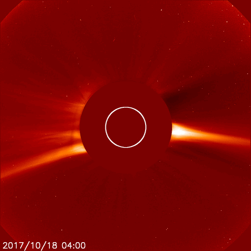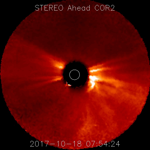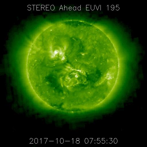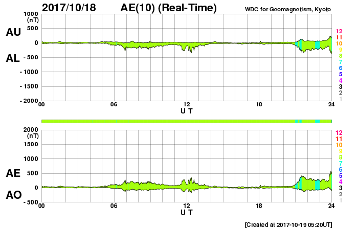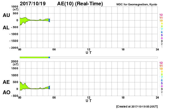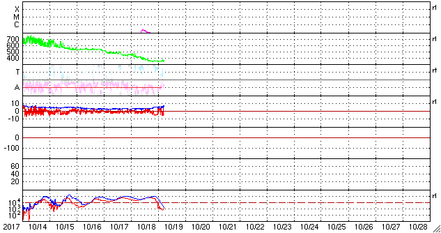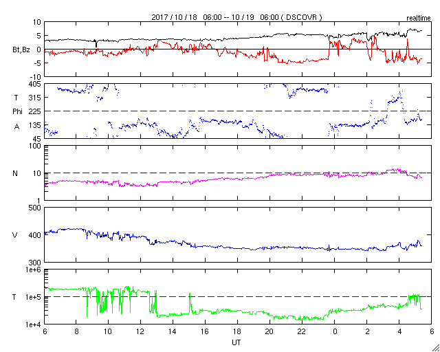 2017/10/19 14:35 更新 太陽の向こう側で活発な活動が続いているようです。太陽風は低速です。 担当 篠原 太陽の向こう側で、活発な活動が続いています。 昨日のニュースの直後、18日15時(世界時18日6時)には、 昨日紹介したCMEを上回る激しいCMEが発生しました。 SOHO衛星LASCO C2,C3の動画と、 太陽の向こう側から観測している、 STEREO Ahead衛星のCOR2カメラの動画を掲載します。 STEREO Ahead衛星では、 CMEのガスが太陽を丸く囲んで広がるハロー型になっています。 発生地点は、STEREO Ahead衛星のEUVI 195を見ると、 太陽の向こう側の中央部南寄りの領域で、 昨日と同じ2682黒点群付近です。 掲載しているSTEREO Ahead衛星の動画は、 現在公開されている写真は 18日17時(世界時18日8時)以降のものになっているため、 フレアの瞬間は見られず、 フレアの後のプロミネンスの輝きが見えています。 引き続き、この領域の活動に注目して下さい。 一方、太陽のこちら側は黒点のない静かな状態が続いています。 X線グラフでは、Bクラスのゆっくりとした変化が観測されていますが、 太陽の向こう側のフレアに関連する変化かもしれません。 太陽風は、速度が350km/秒に下がり、 低速の風になっています。 磁場強度は、3nTから5nT前後に高まり、 平均的な状態です。 磁場の南北成分は、グラフの前半は0nT付近ですが、 後半から南向きに変化する時間帯が目立っています。 このため、AE指数のグラフでも、 後半に500nT近い変化が発生しています。 SDO衛星AIA193の太陽コロナ写真では、 南半球のコロナホールが、太陽の西に進み、 明日くらいから地球に影響がやって来るかもしれません。 また、東側には次のコロナホールが見えています。 前周期の9月27日以降に高速太陽風をもたらした領域です。 今回も、10月24日頃から影響が始まりそうです。