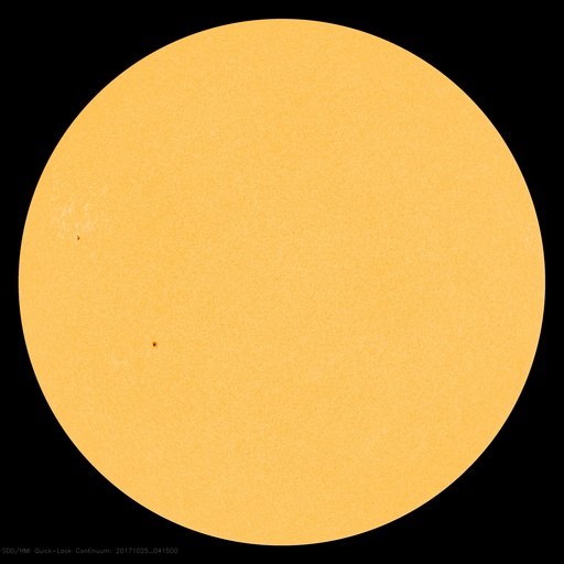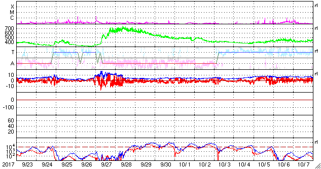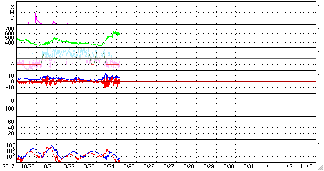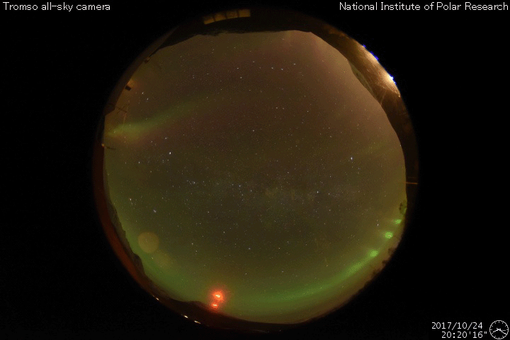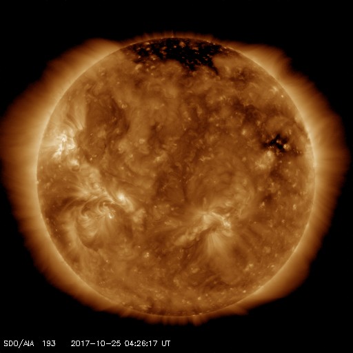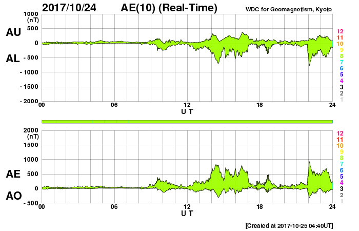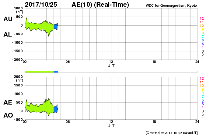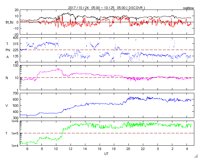 2017/10/25 13:46 更新 高速太陽風が到来し、速度は600km/秒に高まっています。 担当 篠原 昨夜、24日20時(世界時24日11時)頃から、 太陽風速度の上昇が始まり、 24日22時(世界時24日13時)には、500km/秒を超え、 今朝、25日5時(世界時24日20時)には、600km/秒まで高まり、 現在までこの状態が続いています。 磁場強度は、速度が上がり始める頃には15nTまで強まり、 以降も10nT付近に高まった状態が続きました。 現在は、8nTと少し下がっています。 磁場の南北成分は、南に振れたり、北に振れたりしています。 AE指数を見ると、磁気圏の活動も、強まったり、少し落ち着いたりと、 磁場の変化に連動しています。 AE指数のグラフでは、 500〜1000nTの中規模の変化が活発に発生しています。 世界時24日20〜23時頃のオーロラの様子を、 ノルウェーのトロムソの全天カメラで紹介します。 トロムソでは、20時半と22時にオーロラの強まりが発生しています。 27日周期の図を見ると、高速風は前周期と同じ頃に始まりました。 前周期は、5日ほど高速の風が続いていますが、 SDO衛星AIA193を見ると、 コロナホールの広がりは前の周期よりも小さくなっています。 このため、継続期間は前周期より短くなるかもしれません。 太陽は静かな状態が続いています。 2685群、2686群の黒点も小さく、目立ちません。