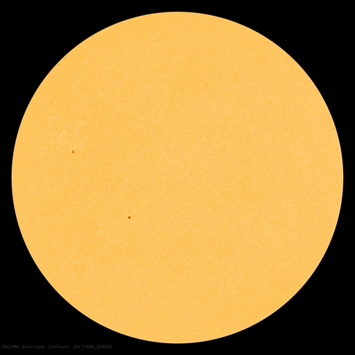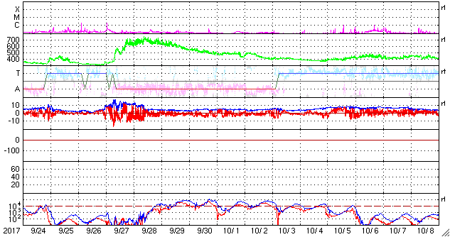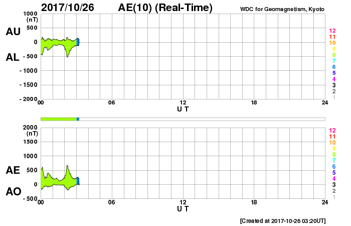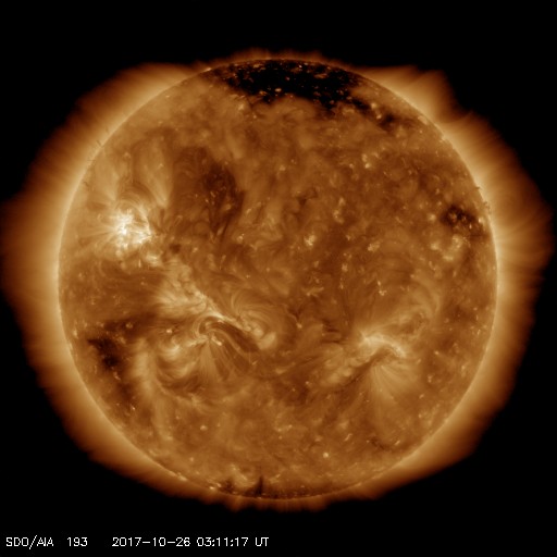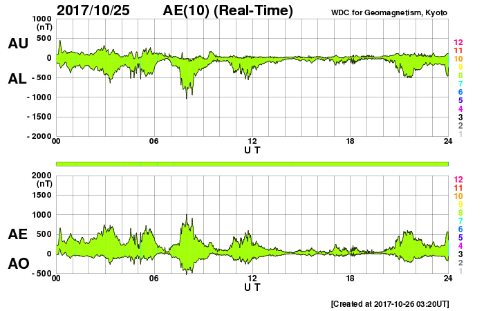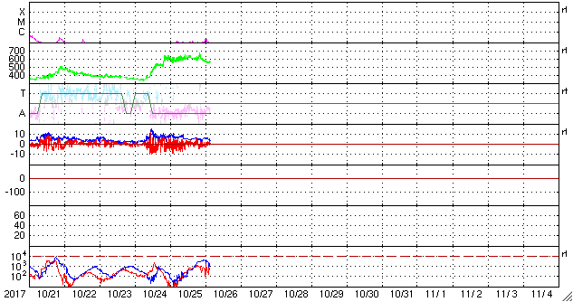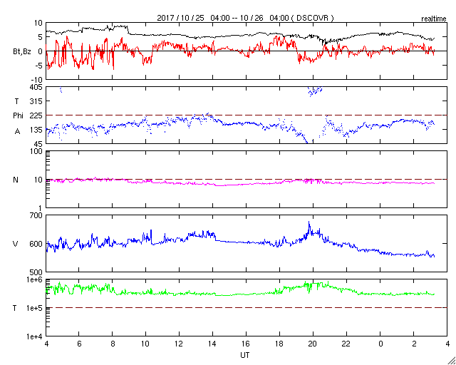 2017/10/26 12:26 更新 高速の太陽風は続いていますが、速度は少し下がっています。 担当 篠原 太陽風の速度は、今朝早くまでは600km/秒台を保っていましたが、 その後一段下がり、現在は560km/秒です。 高速の風は続いています。 太陽風の磁場強度は、5〜7nT付近をゆっくりと変化しています。 概ね平均的な値です。 磁場の南北成分は、グラフの途中から南北への変化が小さくなり、 0nT付近に留まるように傾向が変わっています。 この影響で、AE指数のグラフで変化が発生している時間も、 短くなっているようです。 高速の太陽風は、始まって2日ほどが経過しています。 27日周期の図を見ると、前周期と似た推移になっていますが、 最高速度や磁場強度の強まり方などは、 前周期よりも少し弱くなっているようです。 これから次第に速度は低下していくと思われますが、 継続期間はどのくらいになるでしょうか。 太陽は、目立った変化はなく、 静かな状態が続いています。 ![]() SDO衛星のAIA193カメラによる太陽コロナの様子 (c) SDO (NASA) ![]() SDO衛星による太陽の可視光写真。マウスの矢印を写真に重ねると、黒点番号付きの写真に切り替わります。 (c) SDO (NASA) ![]() DSCOVRが観測した太陽風の磁場(1番上の枠、黒線は全体の強度、赤線は南北成分) および、太陽風の密度(3番目の紫線)、速度(4番目の青線) (c) データ:NOAA/SWPC、作図:宇宙天気ニュース ![]() AE指数(速報値) 下段のAEグラフの値が高くなると、オーロラ活動が活発化しています。 (c) 京都大学WDC ![]() ![]() 27日の太陽周期に合わせたデータプロット 太陽が同じ面を地球に向けていた27日前の変化から、今後を予想することができます。 (c) 作図:宇宙天気ニュース
