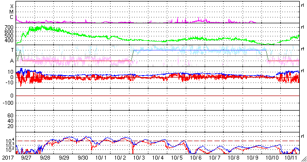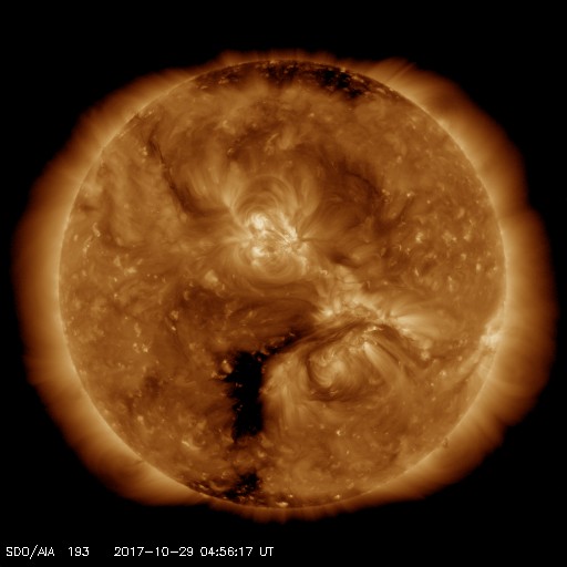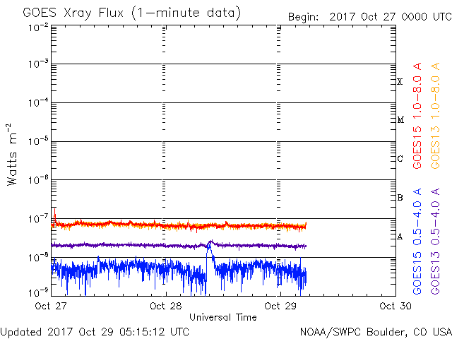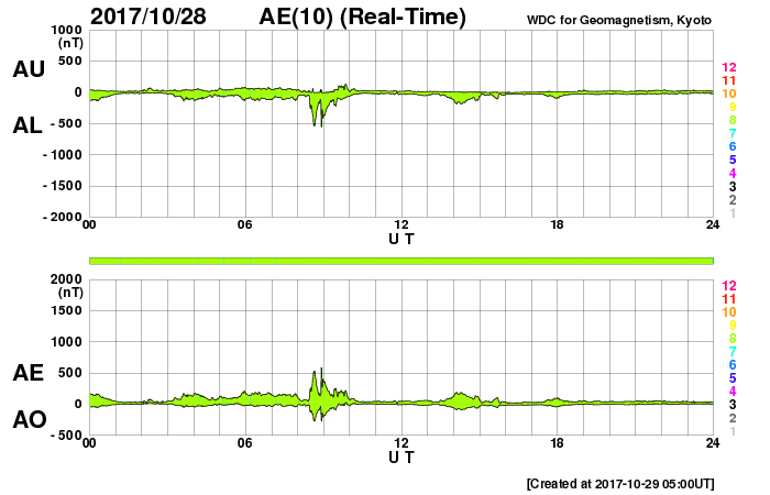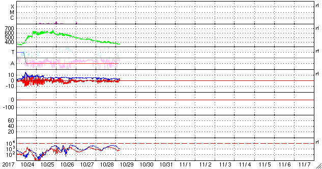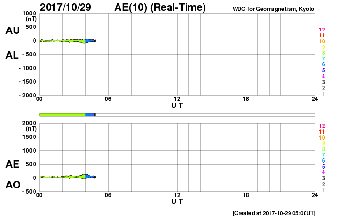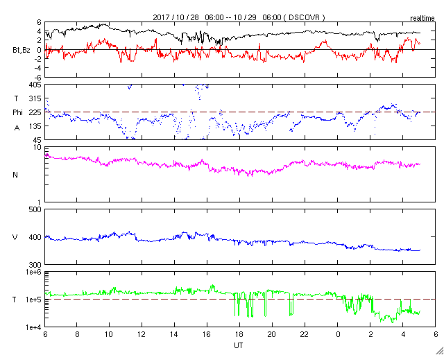 2017/10/29 14:15 更新 太陽風は低速になり、磁気圏も穏やかです。彗星が去りつつあります。 担当 篠原 彗星の動画3日目は、 太陽から遠ざかっていくマックホルツ彗星です。 SOHO衛星LASCO C3の写真の右上方向に向かっています。 太陽風の速度は、今日に入る頃に400km/秒を割り、 現在は350km/秒まで下がって、低速の風に変わっています。 太陽風の磁場強度は、3〜4nTとやや弱くなっています。 南北成分は、弱い南向きに変化していますが、 磁気圏は概ね静穏で、 AE指数は、時々小さい変化が起きている程度です。 SDO衛星AIA193では、太陽の南半球のコロナホールが、 太陽の中央線に達しようとしています。 3〜4日後くらいの太陽風に、高まりが発生するかもしれません。 太陽は、X線グラフに変化はなく、 静かな状態が続いています。