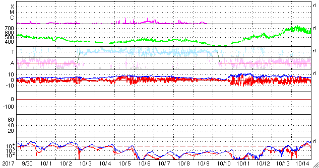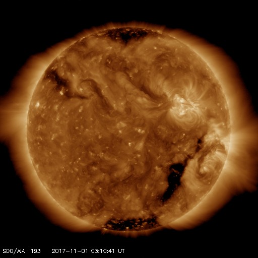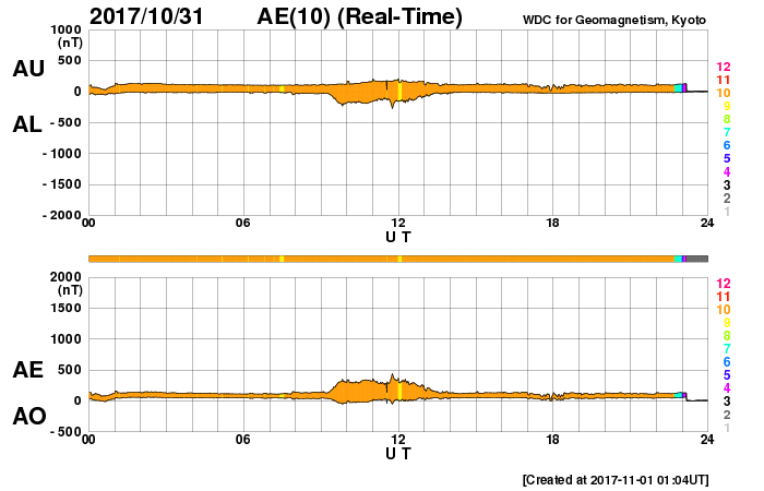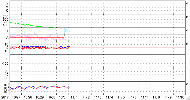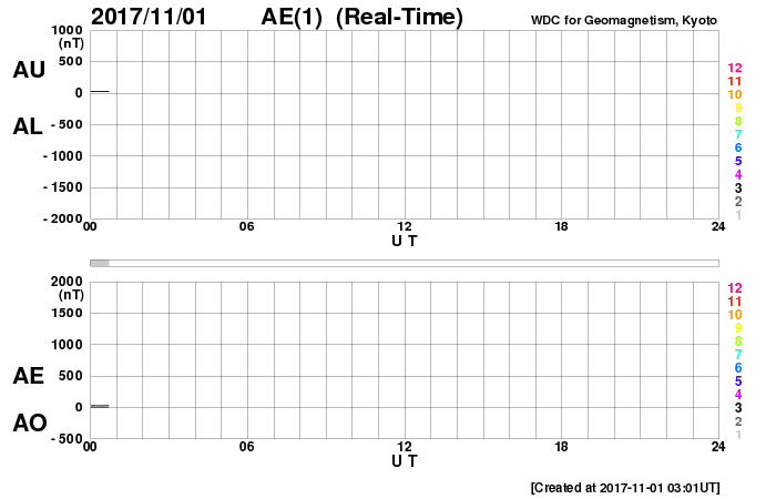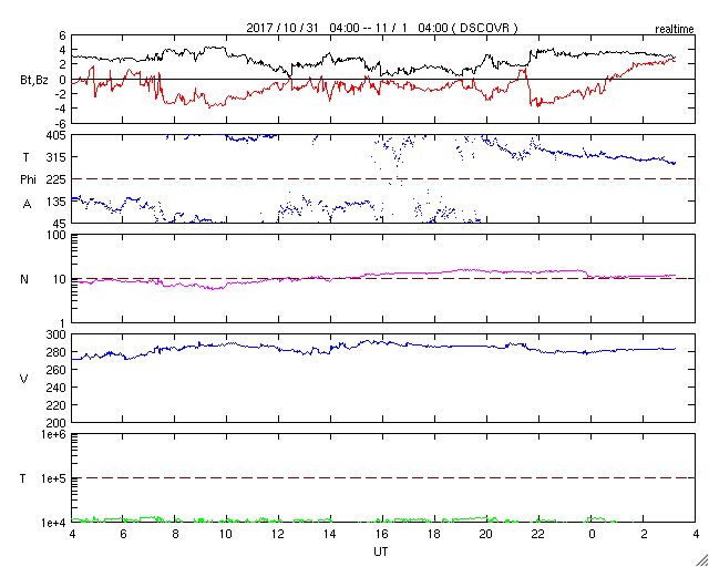 2017/11/ 1 12:25 更新 太陽は無黒点になっています。低速の太陽風が続いています。 担当 篠原 太陽は、2686黒点群もほぼ見えなくなり、 無黒点になっているようです。 X線グラフも変化はなく、太陽はとても静かです。 太陽風は、280km/秒と大きく下がった状態が続いています。 磁場強度も、2〜4nTとやや弱まった状態です。 南北成分は、-2〜 -3nTの弱い南向きが見られ、 AE指数でも、300nT程度の小さい変化が発生していますが、 全体としては穏やかに推移しています。 SDO衛星AIA193では、コロナホールは更に西に進み、 この後、地球へ影響が及び始めるかもしれません。 小規模の変化に留まると思いますが、太陽風の変化に注目してください。 ![]() SDO衛星のAIA193カメラによる太陽コロナの様子 (c) SDO (NASA) ![]() SDO衛星による太陽の可視光写真 (c) SDO (NASA) ![]() GOES衛星の太陽X線データ (c) NOAA/SWPC ![]() DSCOVRが観測した太陽風の磁場(1番上の枠、黒線は全体の強度、赤線は南北成分) および、太陽風の密度(3番目の紫線)、速度(4番目の青線) (c) データ:NOAA/SWPC、作図:宇宙天気ニュース ![]() AE指数(速報値) 下段のAEグラフの値が高くなると、オーロラ活動が活発化しています。 (c) 京都大学WDC ![]() ![]() 27日の太陽周期に合わせたデータプロット 太陽が同じ面を地球に向けていた27日前の変化から、今後を予想することができます。 (c) 作図:宇宙天気ニュース
