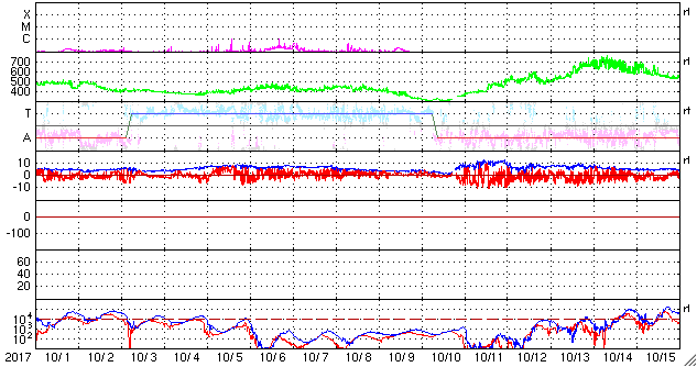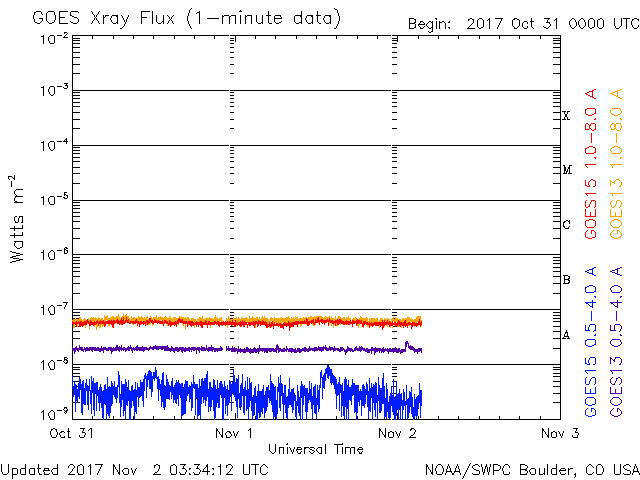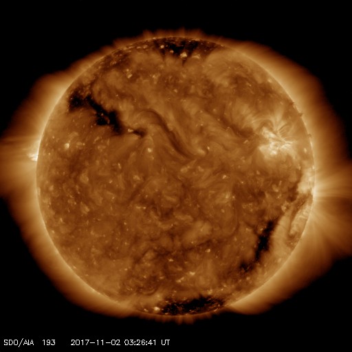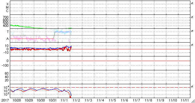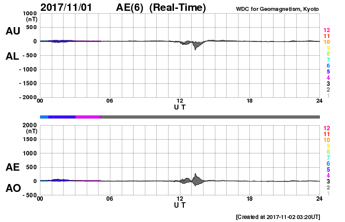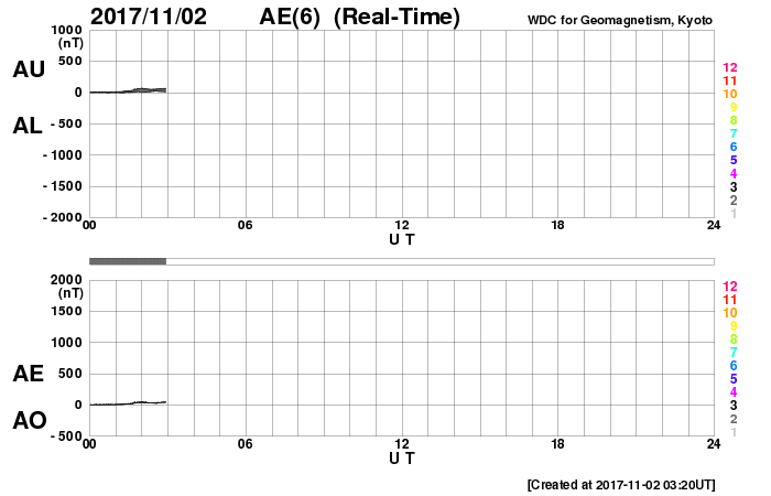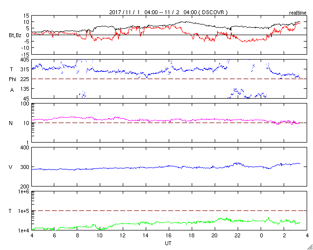 2017/11/ 2 12:31 更新 太陽は無黒点です。太陽風は低速風が続いています。 担当 篠原 太陽は、無黒点になったまま静かな状態が続いています。 X線のグラフも、変化のない状態です。 STEREO Ahead衛星の画像を見ると、 太陽の東端近くに活動的な領域が近づいているようです。 黒点があるのかどうか、今後の出現に注目して下さい。 太陽風は、速度が300km/秒にやや上がりましたが、 低速の風が続いています。 磁場強度は、10nTに強まる変化が発生していますが、 速度と連動する様子は見られません。 SDO衛星AIA193では、南半球のコロナホールは、 西の端に向かって進んでいます。 これから影響が始まるのか、このまま何もなく過ぎていくのか、 引き続き注目してください。 一方、太陽の北東(左上)には、次のコロナホールが見えています。 この領域の影響は、前回は10月11日頃に始まっています。 27日周期で考えると、今回は11月7日頃でしょうか。 前回は、最高速度が700km/秒に達する変化をもたらしました。 今回はどうなるでしょうか。 磁気圏は、基本的には穏やかだと思いますが、 太陽風磁場が強まって、南北成分が -5nT程度に振れているため、 この時間帯に小規模の活動が発生している可能性があります。 今日のAE指数のグラフは、 観測データの数が少ないことを示す灰色の線が目立っています。 このため、参照には注意が必要です。