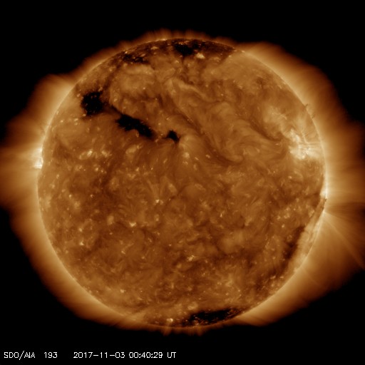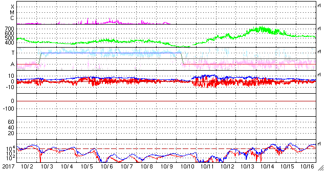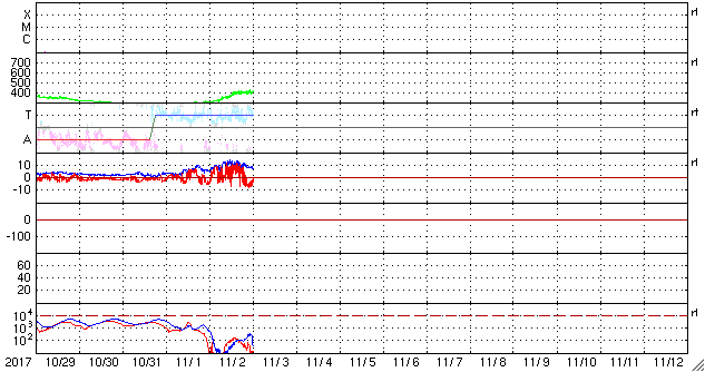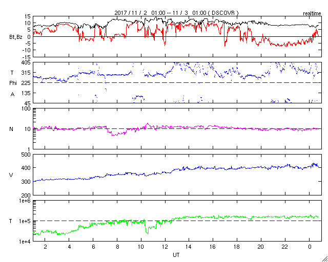 2017/11/ 3 09:55 更新 太陽風の弱い高まりが到来して、平均的な速さに戻っています。 担当 篠原 コロナホールの影響と思われる、 太陽風の弱い高まりが到来しています。 太陽風の磁場強度は、昨夜にかけて15nT近くまで強まりました。 速度もゆっくりと高まって、3日に入る頃、400km/秒に達しました。 その後、磁場強度は低下に向かって、現在は7nTまで下がっています。 一方、速度は400km/秒と平均的な速さで安定しています。 27日周期の図で比較すると、 前周期と同程度の弱い太陽風の高まりが、 今回もやって来た様です。 太陽風磁場の南北成分は、磁場が強まった頃は北向きに振れていました。 このため、磁気圏の活動は穏やかな状態で推移していました。 そして、今朝に入って、磁場強度が下がり始めたころから 南向きに偏るようになり、-5nTを超える変化がしばらく続きました。 磁気圏の活動も同様に高まりを見せ、 AE指数は、グラフの最後に700nTの中規模の高まりが発生しています。 27日周期の図を見ると、 前周期の太陽風は、この弱い高まりが3日ほど続いた後、 一旦速度が下がって、10月11日から次の高速太陽風が始まっています。 発生源のコロナホールは、 今日の写真では、先頭が太陽の中心線に達しています。 太陽は、静かな状態が続いています。 今日も無黒点のままで、 東端から近付いている活動的な領域は、 こちらに現れたかどうかというところで、 黒点の有無はまだ分かりません。