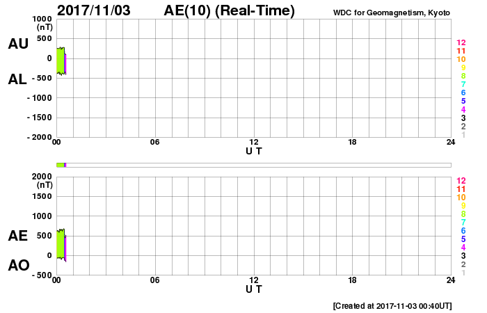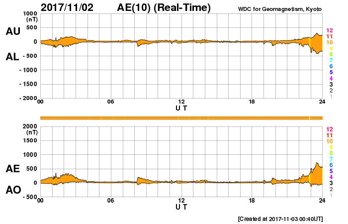 (c) SDO (NASA) ![]() SDO衛星による太陽の可視光写真 (c) SDO (NASA) ![]() DSCOVRが観測した太陽風の磁場(1番上の枠、黒線は全体の強度、赤線は南北成分) および、太陽風の密度(3番目の紫線)、速度(4番目の青線) (c) データ:NOAA/SWPC、作図:宇宙天気ニュース ![]() AE指数(速報値) 下段のAEグラフの値が高くなると、オーロラ活動が活発化しています。 (c) 京都大学WDC ![]() ![]() 27日の太陽周期に合わせたデータプロット 太陽が同じ面を地球に向けていた27日前の変化から、今後を予想することができます。 (c) 作図:宇宙天気ニュース