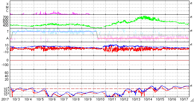 AE指数は、500nT程度の変化が1度発生した程度で、
