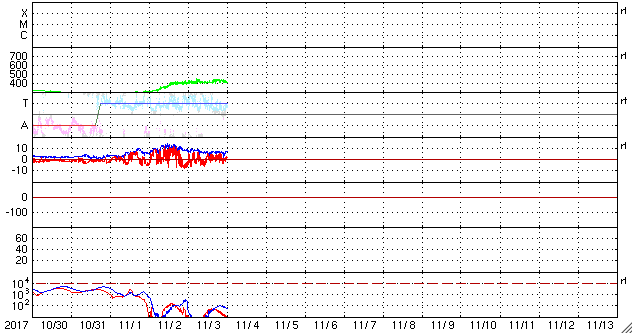 - 2017/11/ 1 12:25 太陽は無黒点になっています。低速の太陽風が続いています。