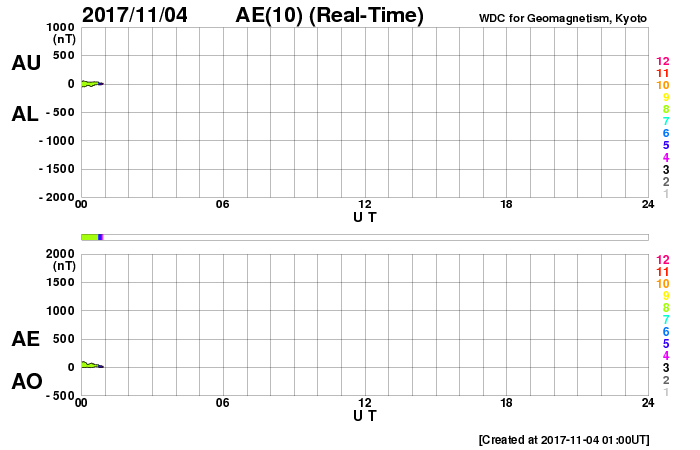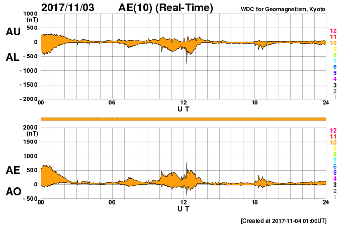 下段のAEグラフの値が高くなると、オーロラ活動が活発化しています。