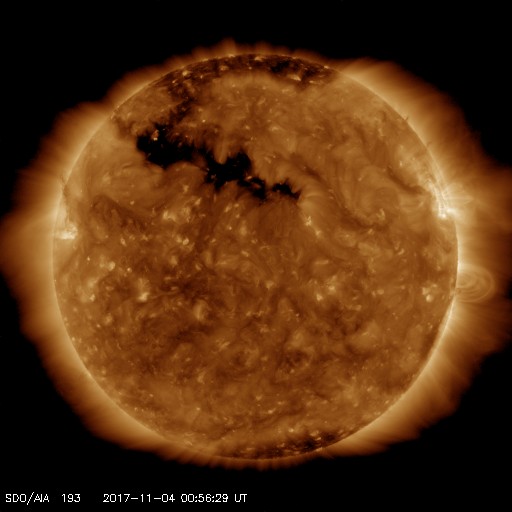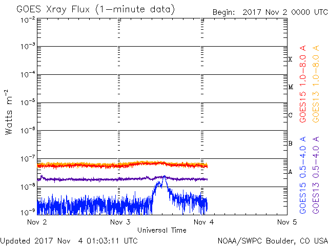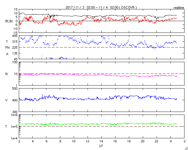 - 2017/11/ 3 09:55 太陽風の弱い高まりが到来して、平均的な速さに戻っています。
