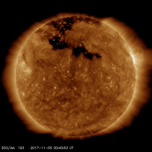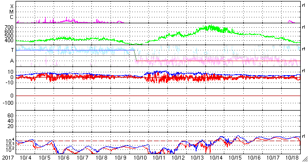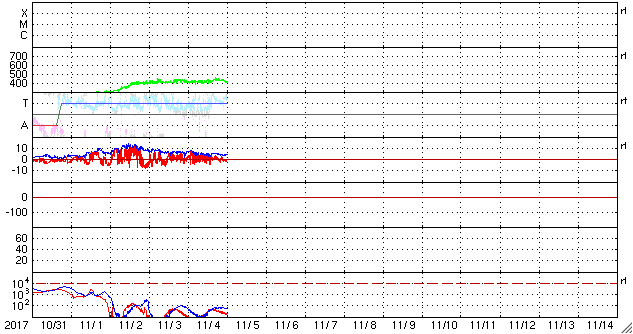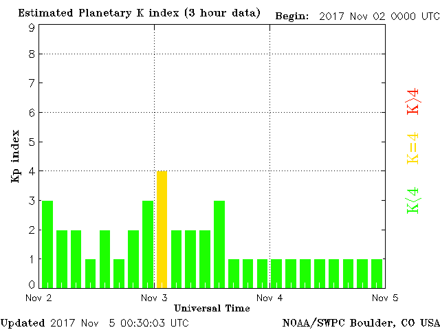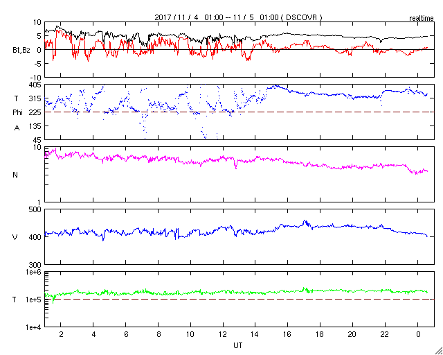 2017/11/ 5 09:48 更新 太陽風、磁気圏は穏やかです。太陽は無黒点が続いています。 担当 篠原 太陽風の速度は、400〜430km/秒と、 平均的な状態で安定しています。 磁場強度も、5nTと平均的な値です。 磁場の南北成分は、0nT付近で小さく変化する程度です。 このため、磁気圏も穏やかな状態が続いていると思われます。 現在、AE指数の図を参照することができないので、 NOAA/SWPCによるPlanetary K-indexのグラフを掲載します。 詳細は、Detailsのページにありますが、 世界各地の地磁気データを集約して、磁気圏の乱れの程度を表します。 これを見ると、11月4日は活動の低い状態が続いています(最低値は0です)。 SDO衛星AIA193の太陽コロナ写真では、 北半球のコロナホールは、 太陽の中心線をはさんで東西に広がっています。 地球の方向へ速度の高い太陽風を噴き出しているところです。 太陽は、無黒点の状態が続いています。 X線のグラフも変化はなく、太陽はとても穏やかです。 ![]() 磁気圏全体の活動度を示す、Planetary K-index。 (c) NOAA/SWPC ![]() SDO衛星のAIA193カメラによる太陽コロナの様子 (c) SDO (NASA) ![]() SDO衛星による太陽の可視光写真 (c) SDO (NASA) ![]() DSCOVRが観測した太陽風の磁場(1番上の枠、黒線は全体の強度、赤線は南北成分) および、太陽風の密度(3番目の紫線)、速度(4番目の青線) (c) データ:NOAA/SWPC、作図:宇宙天気ニュース ![]() 27日の太陽周期に合わせたデータプロット 太陽が同じ面を地球に向けていた27日前の変化から、今後を予想することができます。 (c) 作図:宇宙天気ニュース