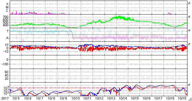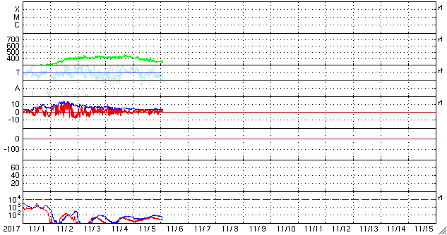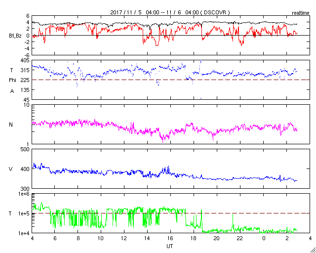 2017/11/ 6 12:02 更新 太陽風は低速になり、磁気圏もとても穏やかです。明日くらいから高速太陽風が始まりそうです。 担当 篠原 太陽風の速度は、400km/秒から350km/秒へ下がり、 低速の風に変わっています。 磁場強度は、4nTに少し下がって安定しています。 27日周期の図を見ると、 前周期も10月10日に一旦低速になって、 11日から、速度が上昇を始めています。 27日の周期で予想すると、 明日くらいから太陽風の変化が始まりそうです。 前周期と同様に、初めに磁場強度が強まり、 続くように速度が上昇を始めると思われます。 磁場が強まった時に、南北成分が南向きに変化すると、 振れ幅が大きくなり、磁気圏の活動を強める可能性があります。 高速風の始まりにも注目してください。 現在の太陽風磁場の南北成分は、北寄りになっています。 速度が下がっていることもあって、磁気圏はとても穏やかで、 AE指数のグラフはほとんど変化が見られません。 太陽は今日も無黒点です。 STEREO Ahead衛星の画像を見ると、 東端の向こう側にも活動的な領域は見られず、 無黒点の状態は更に続きそうです。 X線グラフも変化はなく、太陽はとても穏やかです。 ![]() SDO衛星のAIA193カメラによる太陽コロナの様子 (c) SDO (NASA) ![]() SDO衛星による太陽の可視光写真 (c) SDO (NASA) ![]() DSCOVRが観測した太陽風の磁場(1番上の枠、黒線は全体の強度、赤線は南北成分) および、太陽風の密度(3番目の紫線)、速度(4番目の青線) (c) データ:NOAA/SWPC、作図:宇宙天気ニュース ![]() AE指数(速報値) 下段のAEグラフの値が高くなると、オーロラ活動が活発化しています。 (c) 京都大学WDC ![]() ![]() 27日の太陽周期に合わせたデータプロット 太陽が同じ面を地球に向けていた27日前の変化から、今後を予想することができます。 (c) 作図:宇宙天気ニュース
