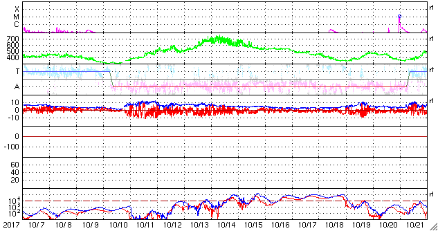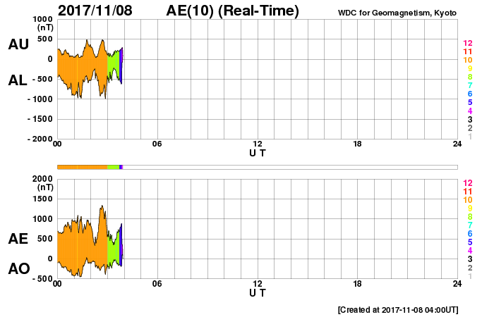 (c) SDO (NASA) ![]() SDO衛星による太陽の可視光写真 (c) SDO (NASA) ![]() DSCOVRが観測した太陽風の磁場(1番上の枠、黒線は全体の強度、赤線は南北成分) および、太陽風の密度(3番目の紫線)、速度(4番目の青線) (c) データ:NOAA/SWPC、作図:宇宙天気ニュース ![]() AE指数(速報値) 下段のAEグラフの値が高くなると、オーロラ活動が活発化しています。 (c) 京都大学WDC ![]() ![]() 27日の太陽周期に合わせたデータプロット 太陽が同じ面を地球に向けていた27日前の変化から、今後を予想することができます。 (c) 作図:宇宙天気ニュース