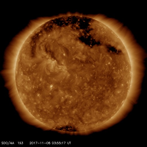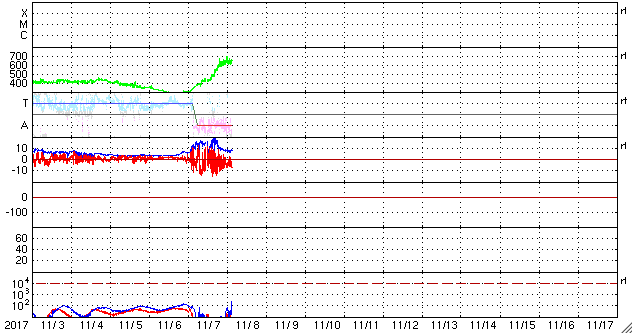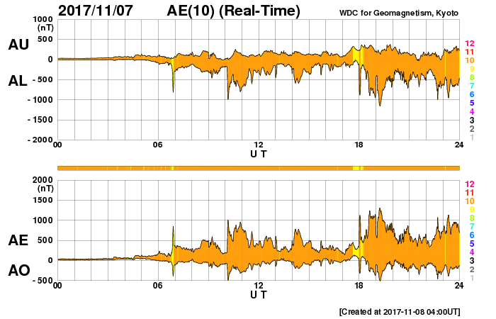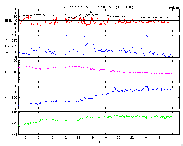 2017/11/ 8 13:10 更新 太陽風の速度は650km/秒に高まり、磁気圏の活動も強まっています。 担当 篠原 高速の太陽風が始まり、磁気圏の活動も活発になっています。 昨日のニュースの後、 太陽風の磁場強度は10nTを超えて強まりました。 夜になると速度も上昇を始め、深夜に500km/秒に達しました。 磁場強度もこの頃に20nTに達しています。 一方、磁場が10nTに強まった頃から、 南北成分は南向きに振れる様になり、 磁気圏の活動も強まって行きました。 AE指数は、500nTから1000nTに達する中規模の変化が続きます。 そして、今日、8日に入ると、 速度は600km/秒を超えて、650km/秒まで高まります。 反対に磁場強度は下がり始め、10nTを割るくらいになりました。 磁場の南北成分は、南寄りの傾向が続き、 速度が一段と高まったこともあって、 AE指数の変化は1000nTを超えるくらいまで強まっています。 現在の太陽風は、速度は650km/秒を保っていますが、 磁場強度は5nTに戻りかけています。 高速風の領域としては、中盤を迎えているようです。 このまま磁場の南寄りの傾向が続けば、 磁気圏も活発な状態を保つでしょう。 27日周期の図を見ると、 前周期の高速太陽風は7日ほど続いています。 今回は、コロナホールの東西方向の広がりがやや狭くなっているようで、 高速風の期間も短くなるかもしれません。 太陽は、無黒点でとても静かです。