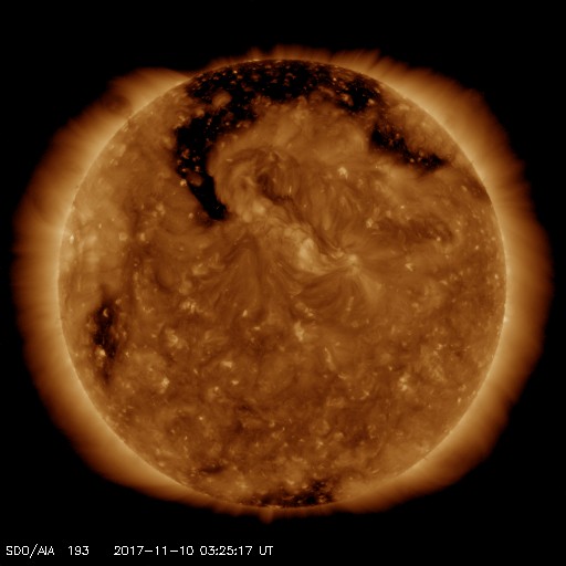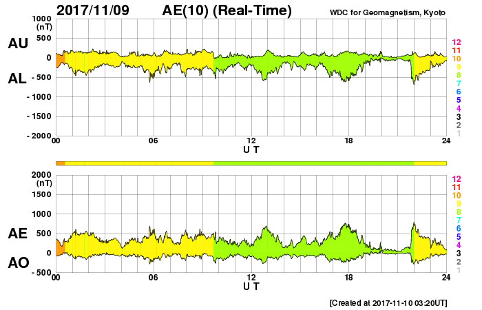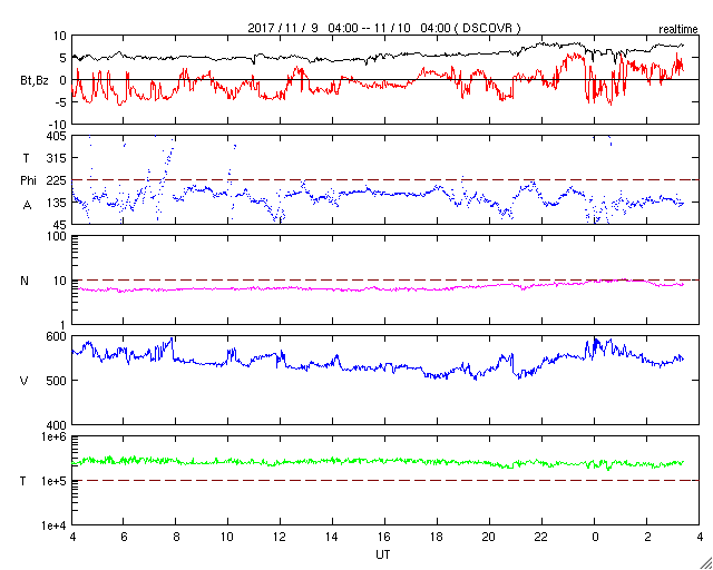2017/11/10 12:39 更新 高速太陽風の速度は下がり始めています。磁気圏は活動的です。 担当 篠原 太陽風の速度は、昨日のニュース以降もゆっくり下がって、 今朝早くには、500km/秒近くまで下がりました。 その後、再び580km/秒くらいまで高まり、 すぐに下げて540km/秒くらいで落ち着くという変化をしています。 磁場強度は5nTから7nTに少し強まる変化をしています。 変化の様子から、高速太陽風はしばらく続きそうですが、 27日周期の図の前周期と比較すると、様子が変わっているようで、 この後、もう一度速度が高まる2つめの山がやって来るのか、 ゆっくりと下がっていくことになるのか、 この後の変化に注目してください。 SDO衛星AIA193では、 今回の高速風の発生源のコロナホールは、 太陽の北西の端(右上)にだいぶ近づいています。 一方、太陽の東からは、 北極から赤道付近に伸びる細長いコロナホールが近づいています。 27日前と比べて、コロナホールの広がりが大きくなっていて、 地球への影響も強まるかもしれません。 5日後の11月15日頃の太陽風に注目してください。 磁気圏の活動は、活発な状態が続いていますが、 変化の規模は小さくなっていて、 AE指数は、500nT前後の変化に下がっています。 今回の高速太陽風の影響で、 放射線帯の高エネルギー電子が増加しています。 GOES15(青線)は5万近くまで増加し、 GOES13(青線)も1万を超えています。 太陽は、無黒点で穏やかな状態が続いています。 ![]() SDO衛星のAIA193カメラによる太陽コロナの様子 (c) SDO (NASA) ![]() SDO衛星による太陽の可視光写真 (c) SDO (NASA) ![]() DSCOVRが観測した太陽風の磁場(1番上の枠、黒線は全体の強度、赤線は南北成分) および、太陽風の密度(3番目の紫線)、速度(4番目の青線) (c) データ:NOAA/SWPC、作図:宇宙天気ニュース ![]() AE指数(速報値) 下段のAEグラフの値が高くなると、オーロラ活動が活発化しています。 (c) 京都大学WDC ![]() ![]() 27日の太陽周期に合わせたデータプロット 太陽が同じ面を地球に向けていた27日前の変化から、今後を予想することができます。 (c) 作図:宇宙天気ニュース
