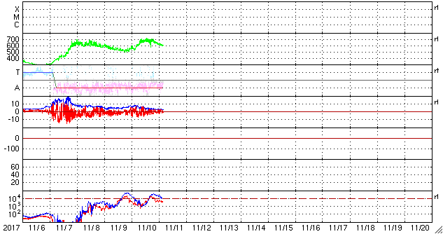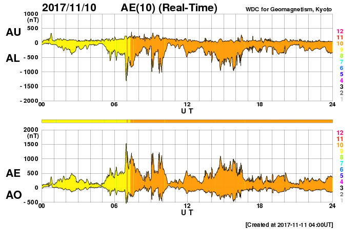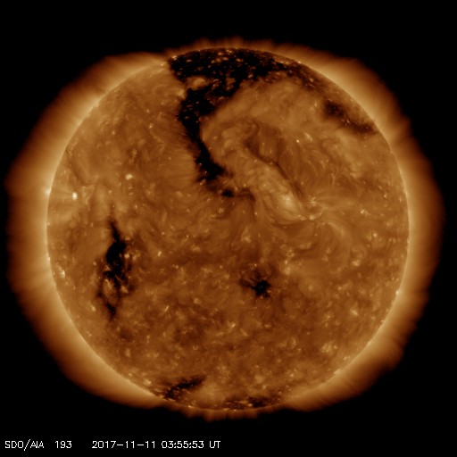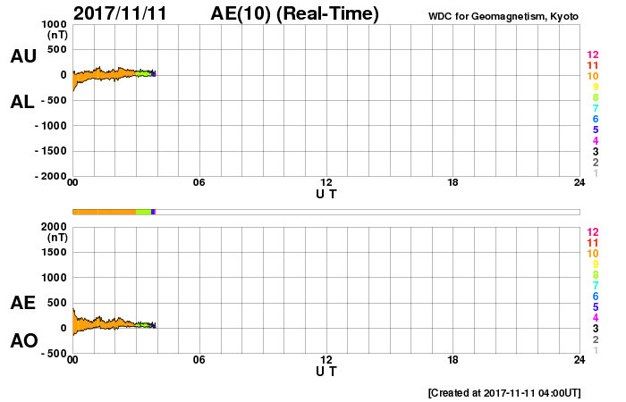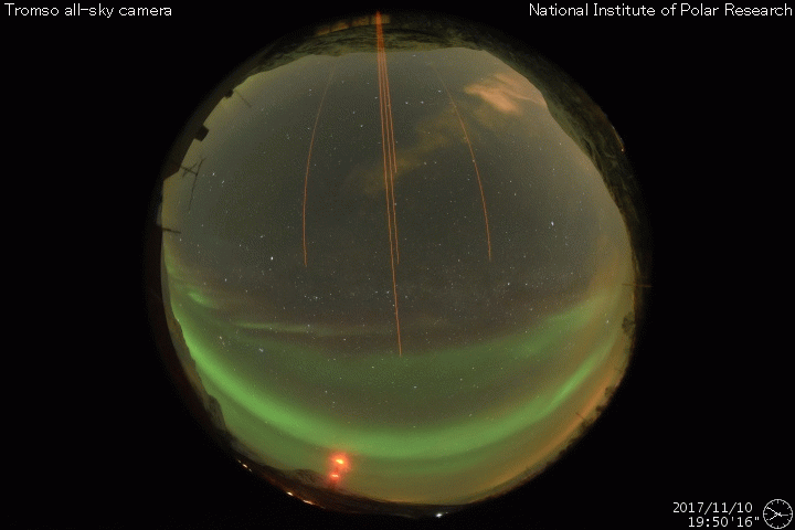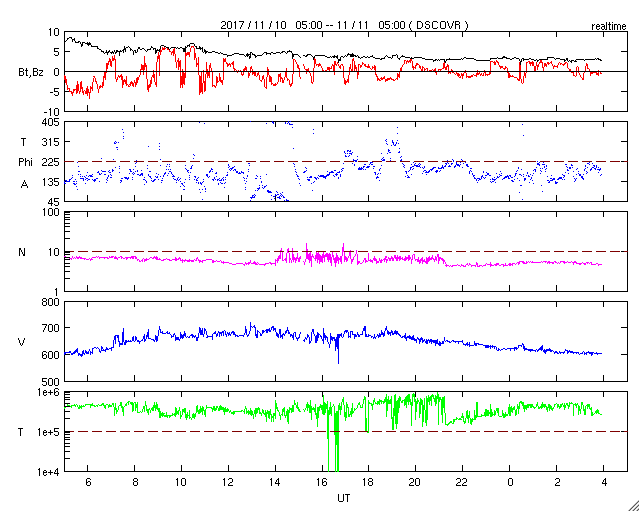 2017/11/11 13:02 更新 太陽風の速度は再び600km/秒台に高まっています。 担当 篠原 昨日のニュースの後、太陽風の速度は再び上昇し、 10日18時(世界時10日9時)には、680km/秒まで高まりました。 今回の高速太陽風の最初のピーク(11月8日)の頃と、 同じくらいの速さに上がっています。 そのまま、今朝早く、11日4時(世界時10日19時)まで、 680km/秒の高速状態が続き、 以降、速度は低下を始めています。 現在は、ちょうど600km/秒まで下がったところです。 27日周期の図を参照すると、 前周期の高速風は、10月14日に最高速度に達していました。 今回の速度の高まりは、 前回のこの変化の回帰だったと言えそうです。 太陽風の磁場強度は、速度が高まり始める頃は5nTと平均的な値で、 以降、少しずつ弱くなり、現在は3nTに下がっています。 南北成分は、グラフの前半は -5nTの南向きの変化が発生していますが、 後半は南北の変化が目立たなくなっています。 磁気圏の活動もこれに対応して、AE指数のグラフは、 10日の中盤までは、1000nTに達する大きな変化が続いていますが、 以降は300nT程度の小規模の変化に留まっています。 世界時10日20〜21時のノルウェー・トロムソの 全天カメラの動画を掲載します。 AE指数のグラフでは、変化は小ぶりになっている頃ですが、 空全体を明るいオーロラが輝いています。 前周期の太陽風は、この後3日ほどかけて平均的な速度に下がりました。 今回も同程度と考えると、14日頃まででしょうか。 放射線帯の高エネルギー電子は、1万を超えた状態が続いています。 太陽は無黒点が続いています。 X線のグラフも変化のない状態です。 ![]() ノルウェーのトロムソで、世界時10日20〜21時頃に撮影されたオーロラ。 (c) 国立極地研究所、(動画加工 : 宇宙天気ニュース) ![]() SDO衛星のAIA193カメラによる太陽コロナの様子 (c) SDO (NASA) ![]() SDO衛星による太陽の可視光写真 (c) SDO (NASA) ![]() DSCOVRが観測した太陽風の磁場(1番上の枠、黒線は全体の強度、赤線は南北成分) および、太陽風の密度(3番目の紫線)、速度(4番目の青線) (c) データ:NOAA/SWPC、作図:宇宙天気ニュース ![]() AE指数(速報値) 下段のAEグラフの値が高くなると、オーロラ活動が活発化しています。 (c) 京都大学WDC ![]() ![]() 27日の太陽周期に合わせたデータプロット 太陽が同じ面を地球に向けていた27日前の変化から、今後を予想することができます。 (c) 作図:宇宙天気ニュース