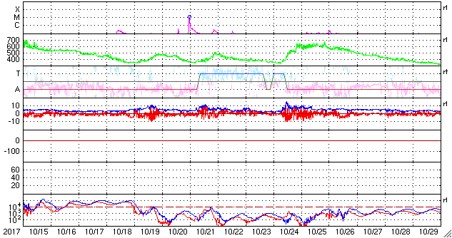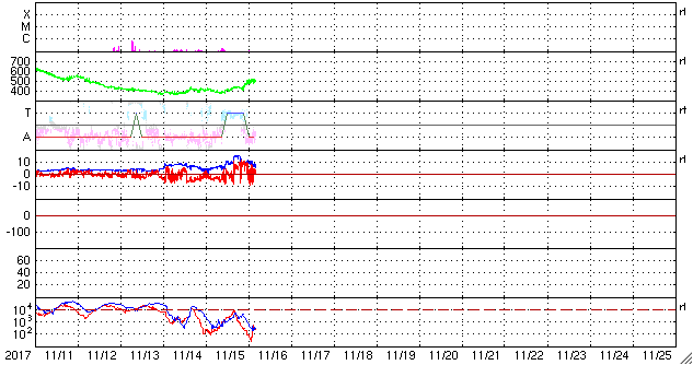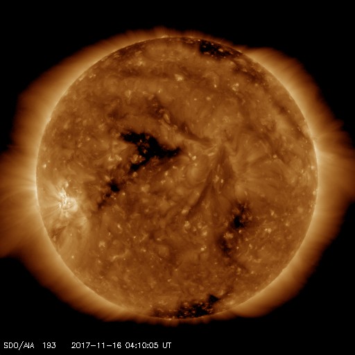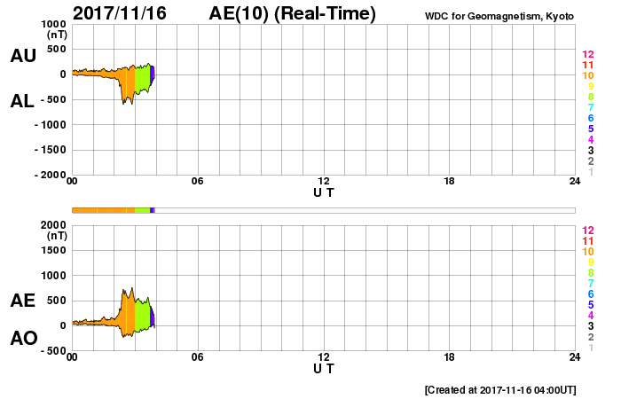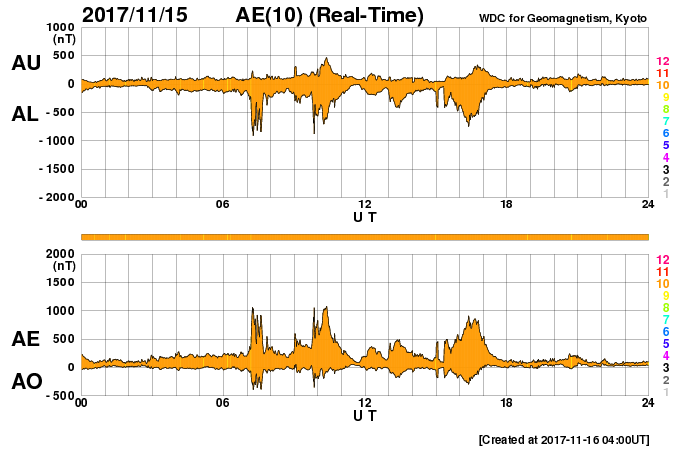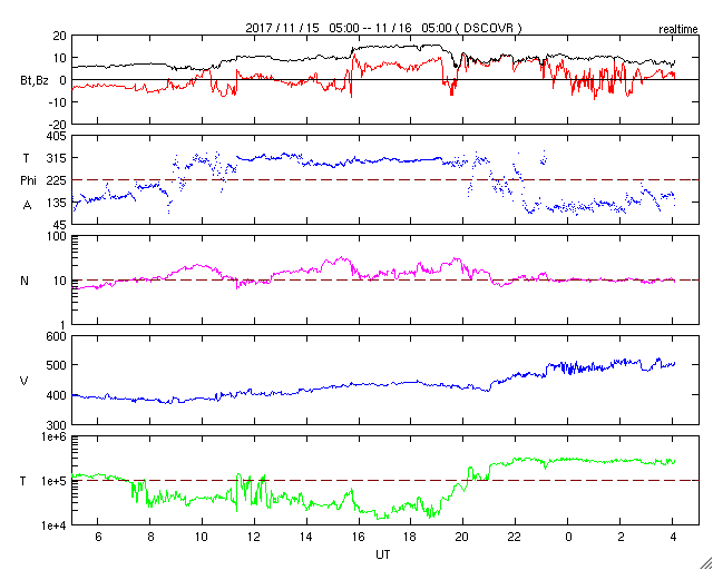 2017/11/16 13:18 更新 太陽風の速度が500km/秒に高まっています。 担当 篠原 昨夜遅く、太陽風の磁場強度が15nTに強まる変化が到来し、 その後、速度も上昇を始めて、500km/秒の高速風に達しています。 磁場強度は、一段下がっていますが、 依然10nT近くに強まった状態です。 27日周期の図の前周期の10月19〜22日にかけて見られた、 太陽風の弱い高まりが今回も回帰してきたようです。 前周期と同程度の変化であれば、速度の高まりはこの辺りで終わり、 2日程度の乱れになりそうです。 一方、現在も磁場強度は強まっているため、 速度ももう一段高まるかもしれません。 引き続き、太陽風の変化に注目して下さい。 太陽風磁場の南北成分は、 全体としては北向きに強まっている様です。 このため、磁場が一時的に南向きに変化したときに、 磁気圏の活動を高めていて、 AE指数は、1000nT近い中規模の活動が起きたり、 静かになったりを繰り返しています。 SDO衛星AIA193の太陽写真では、 赤道域に広がるコロナホールが、太陽の中央線に達しています。 この領域は、27日前も10月24日に高速太陽風をもたらしています。 今回は11月20日頃でしょうか。 太陽は、南東(左下)に2687黒点群が見えていますが、 目立った活動はなく、穏やかに推移しています。 ![]() SDO衛星のAIA193カメラによる太陽コロナの様子 (c) SDO (NASA) ![]() SDO衛星による太陽の可視光写真。マウスの矢印を写真に重ねると、黒点番号付きの写真に切り替わります。 (c) SDO (NASA) ![]() DSCOVRが観測した太陽風の磁場(1番上の枠、黒線は全体の強度、赤線は南北成分) および、太陽風の密度(3番目の紫線)、速度(4番目の青線) (c) データ:NOAA/SWPC、作図:宇宙天気ニュース ![]() AE指数(速報値) 下段のAEグラフの値が高くなると、オーロラ活動が活発化しています。 (c) 京都大学WDC ![]() ![]() 27日の太陽周期に合わせたデータプロット 太陽が同じ面を地球に向けていた27日前の変化から、今後を予想することができます。 (c) 作図:宇宙天気ニュース