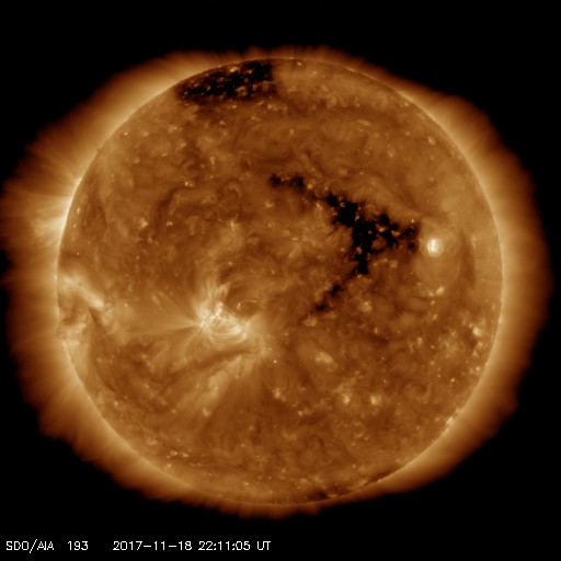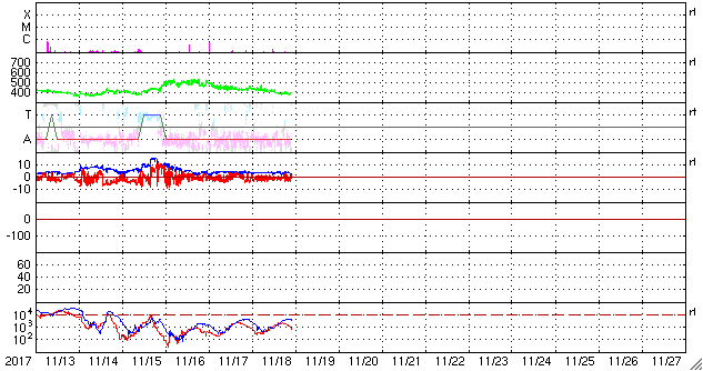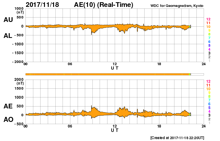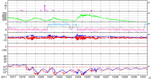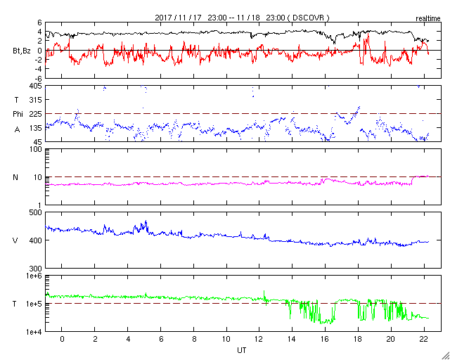2017/11/19 07:30 更新 太陽風は平均的な状態です。2687黒点群が見えなくなりそうです。 担当 篠原 太陽風の速度は、390km/秒へやや下がりましたが、 平均的な状態が続いています。 磁場強度も、4nTと平均的な値で安定していましたが、 最新のところで、2nTに下がっています。 27日周期の図で前周期の変化を見ると(10月23〜24日)、 高速太陽風の始まりにかけて、 速度、磁場強度ともに下がっていく変化が見られます。 今回も明日にかけて同様の傾向が見られるのかもしれません。 SDO衛星AIA193の太陽写真では、 赤道付近のコロナホールは更に西に進み、 地球へ影響が及び始める目安の位置に近づいています。 今後の太陽風の変化に注目してください。 太陽風磁場の南北成分は、弱い南寄りの傾向です。 磁気圏では小規模の活動が時々発生していて、 AE指数には500nT程度の変化が数回発生しています。 太陽は、2687黒点群が微かになり、見えなくなりそうです。 X線グラフも目立った変化はありません。