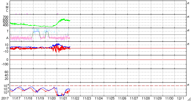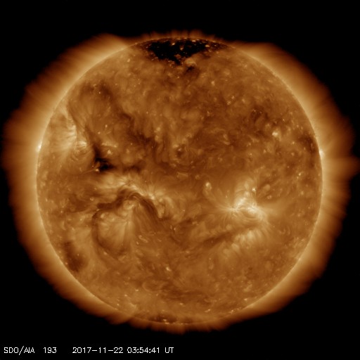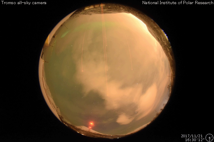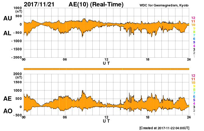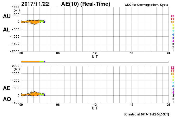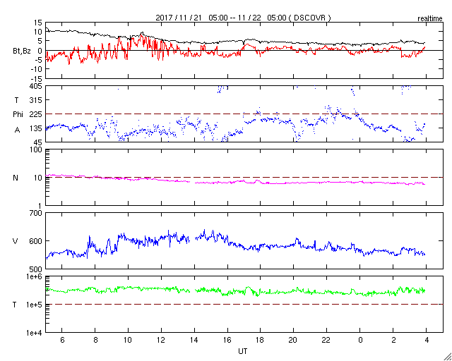 2017/11/22 13:02 更新 高速の太陽風が続いています。太陽は無黒点で穏やかです。 担当 篠原 太陽風の速度は、 昨日の夜にかけて600km/秒まで高まりました。 その後は少しずつ下がり、現在は550km/秒です。 高速の太陽風は続いています。 太陽風の磁場強度は、 速度の高まりとともに10nTから5nTへ下がり、 その後、現在にかけて4nT付近で安定しています。 磁場の南北成分は、昨夜までは南寄りに振れていましたが、 その後は0nT付近で小さく変化するようになっています。 オーロラの活動度を表すAE指数は、 今朝までは500〜800nTの中規模の変化が続いていましたが、 その後は、変化が小さくなっています。 ノルウェーのトロムソは、曇りがちの空でしたが、 世界時21日17時のオーロラの強まりが撮影されています。 AE指数で、600nT程度の高まりになっている頃です。 SDO衛星AIA193では、 今回の高速風の発生源のコロナホールは、 太陽の西の端に近づいて、ほとんど見えなくなっています。 高速の太陽風は、次第に弱まっていきそうです。 太陽は、今日も黒点は見えず、 静かな状態が続いています。