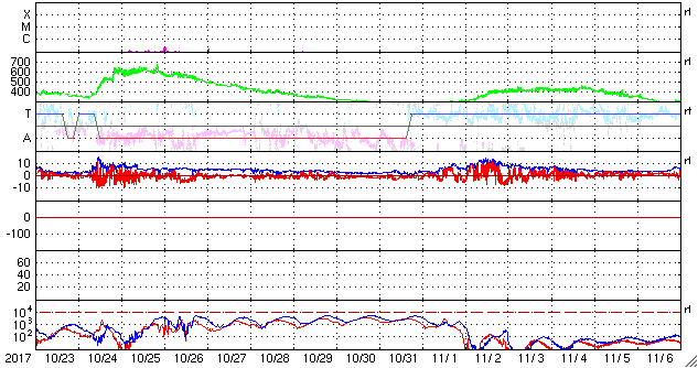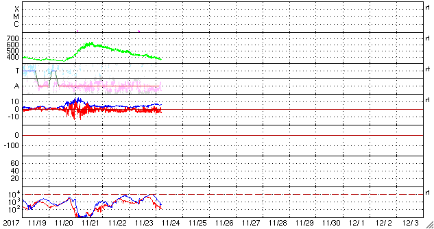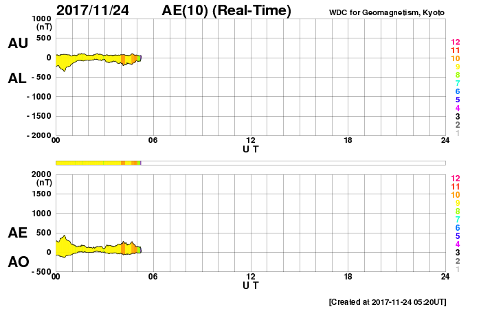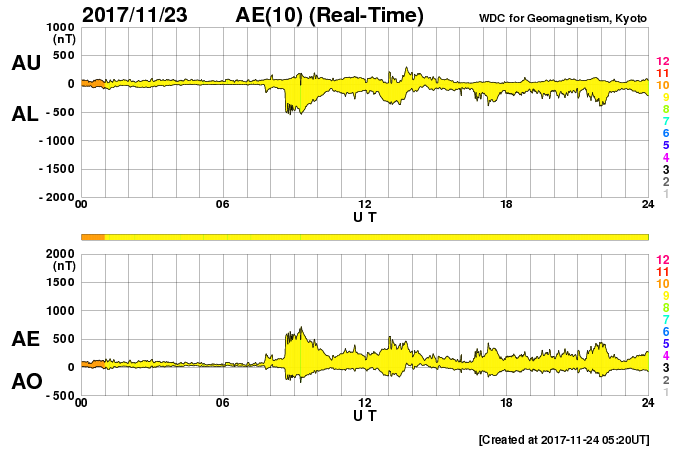 (c) SDO (NASA) ![]() SDO衛星による太陽の可視光写真 (c) SDO (NASA) ![]() DSCOVRが観測した太陽風の磁場(1番上の枠、黒線は全体の強度、赤線は南北成分) および、太陽風の密度(3番目の紫線)、速度(4番目の青線) (c) データ:NOAA/SWPC、作図:宇宙天気ニュース ![]() AE指数(速報値) 下段のAEグラフの値が高くなると、オーロラ活動が活発化しています。 (c) 京都大学WDC ![]() ![]() 27日の太陽周期に合わせたデータプロット 太陽が同じ面を地球に向けていた27日前の変化から、今後を予想することができます。 (c) 作図:宇宙天気ニュース