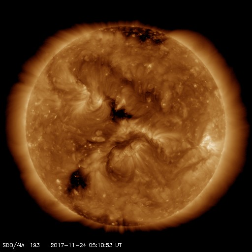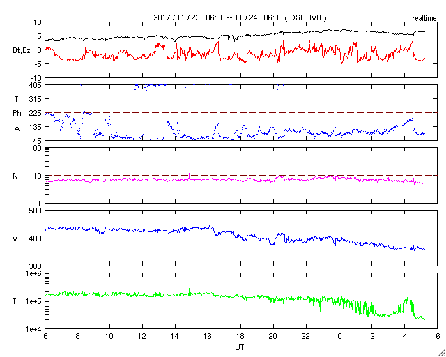 2017/11/24 14:22 更新 太陽風は低速風に変わりかけています。 担当 篠原 太陽風の速度は、昨日の昼頃に430km/秒に下がり、 平均的な速さに戻りました。 そのまま深夜まで400km/秒台を保ちましたが、 今日に入ると更に下がって、 現在は370km/秒と低速風に変わりつつあります。 磁場強度は、5〜6nTと平均的な状態で安定しています。 27日周期の図で前周期を見ると、 10月30日以降は、300km/秒付近の低速風になっています。 今回も同様の推移をすると、 この後も太陽風の速度は次第に下がっていきそうです。 太陽風の速度は下がってきましたが、 磁気圏では弱い活動が続いていて、 AE指数は、300nT程度の変化が頻繁に発生しています。 太陽風磁場の南北成分が、 弱い南寄りの状態になっているためでしょう。 今後、太陽風の速度が更に下がっていくと、 AE指数の変化も目立たなくなりそうです。 SDO衛星AIA193の太陽写真では、 太陽の中央付近に小さいコロナホールが見えています。 このコロナホールは、27日前には見えていなかった領域です。 小さいので影響は限定的だと思いますが、 3〜4日後の太陽風に多少の影響をもたらすかもしれません。 また、南半球の東側(左側)に見えるコロナホールは、 前周期は、11月2日に太陽風の弱い高まりをもたらしています。 今回は、11月29日頃でしょうか。 太陽は、無黒点で穏やかな状態が続いています。
