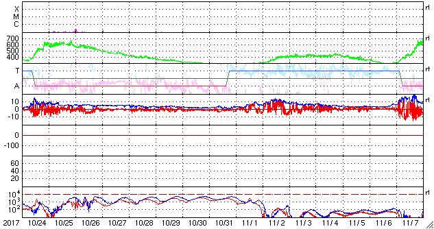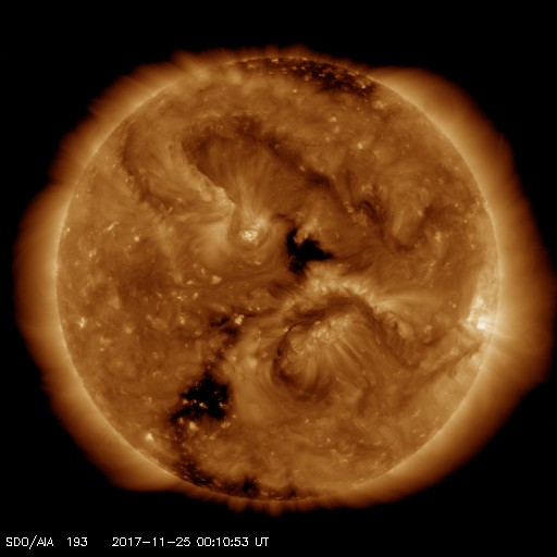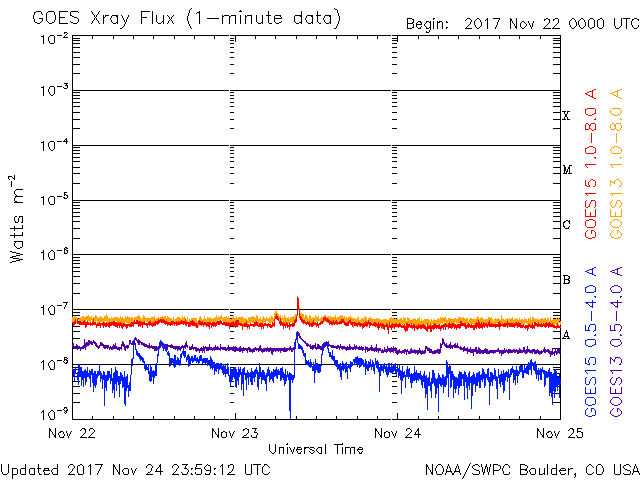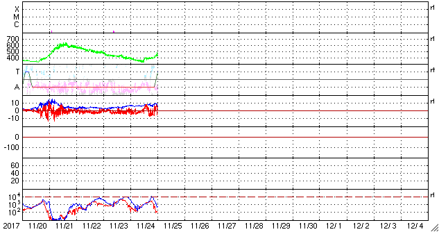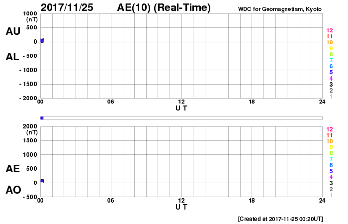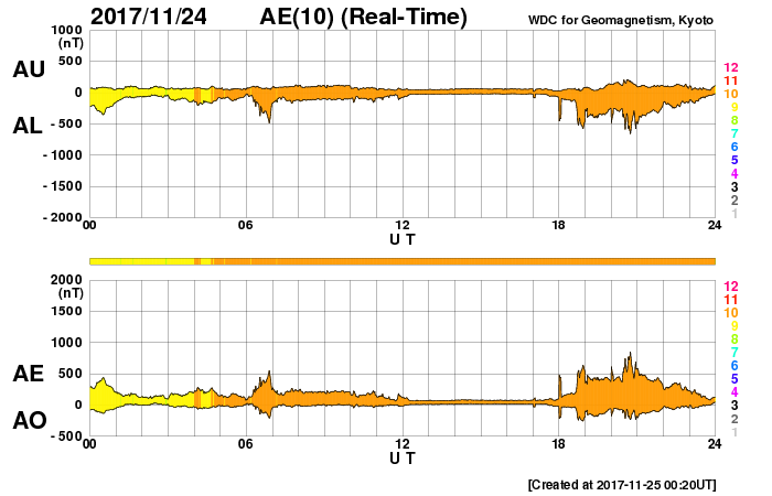 2017/11/25 09:30 更新 新しい黒点が発生しています。太陽風は平均的な速度に上がっています。 担当 篠原 太陽の北半球の中心付近に、新しい黒点が出現しています。 2689黒点群と番号が付けられそうです。 掲載の可視光写真でも小さく見えています。 フレアなどの発生は特に見られず、 X線グラフは変化のない状態が続いています。 太陽風は、昨夜から今朝にかけて430km/秒程度に速度が高まり、 低速風から平均的な速さの風に戻っています。 磁場強度も、10nT近くまで高まり、 グラフの最後で5nTに下がるという変化をしています。 SDO衛星AIA193の太陽写真では、 北半球のコロナホールはまだ中央線を通過した程度で、 影響の始まりとしては早すぎるように思います。 太陽風の一時的な変化なのか、このまま高速風に繋がっていくのか、 前周期とは違う推移になっているので、注目してください。 太陽風磁場の南北成分は、強度が高まったこともあり、 +5nTから -5nTにかけて、南北の変化をしています。 このため、AE指数では500〜800nTの中規模の変化が発生しています。 このやや活動的な状況は続くでしょうか。 ![]() SDO衛星のAIA193カメラによる太陽コロナの様子 (c) SDO (NASA) ![]() SDO衛星による太陽の可視光写真。マウスの矢印を写真に重ねると、黒点番号付きの写真に切り替わります。 (c) SDO (NASA) ![]() GOES衛星の太陽X線データ (c) NOAA/SWPC ![]() DSCOVRが観測した太陽風の磁場(1番上の枠、黒線は全体の強度、赤線は南北成分) および、太陽風の密度(3番目の紫線)、速度(4番目の青線) (c) データ:NOAA/SWPC、作図:宇宙天気ニュース ![]() AE指数(速報値) 下段のAEグラフの値が高くなると、オーロラ活動が活発化しています。 (c) 京都大学WDC ![]() ![]() 27日の太陽周期に合わせたデータプロット 太陽が同じ面を地球に向けていた27日前の変化から、今後を予想することができます。 (c) 作図:宇宙天気ニュース
