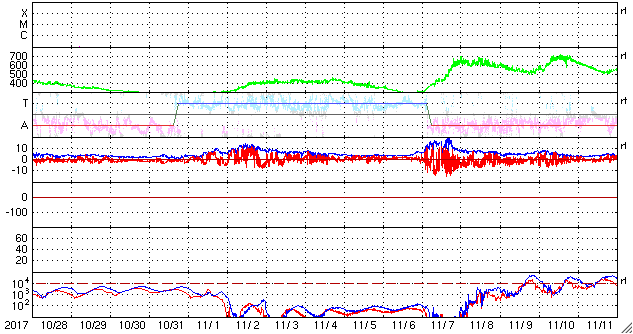 下段のAEグラフの値が高くなると、オーロラ活動が活発化しています。