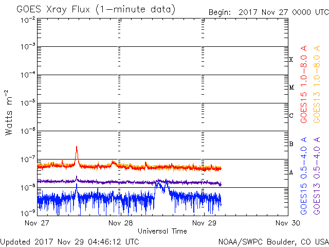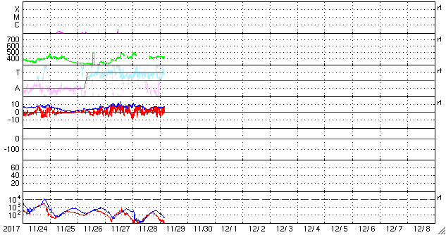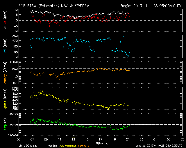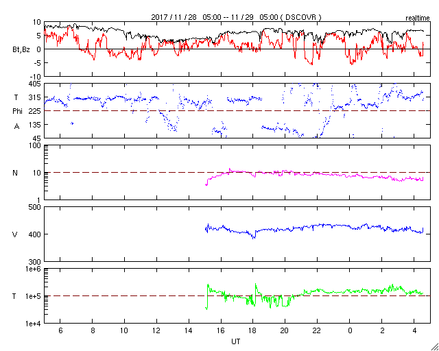 2017/11/28 13:06 コロナホールの影響が到来して、太陽風の速度がやや高まっています。