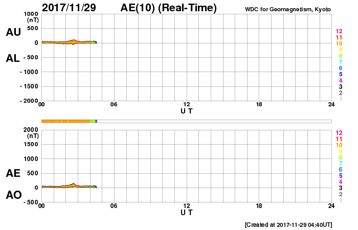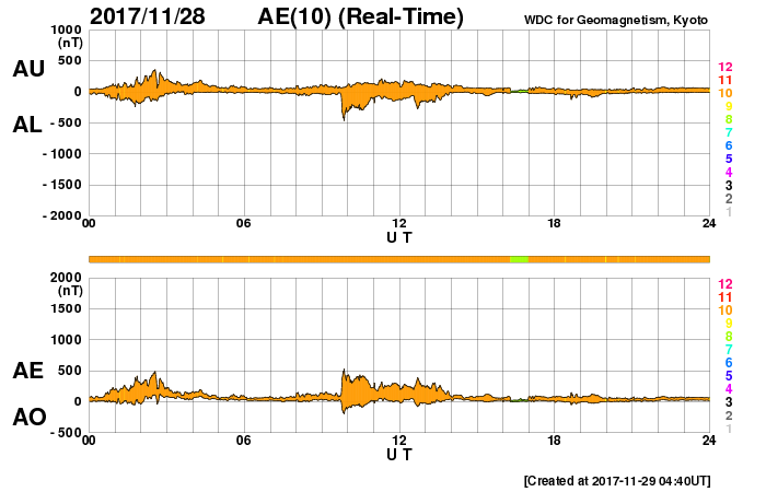 AE指数のグラフでは、500nT程度の小規模の活動も起きています。