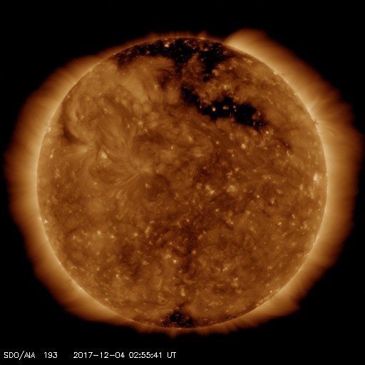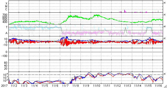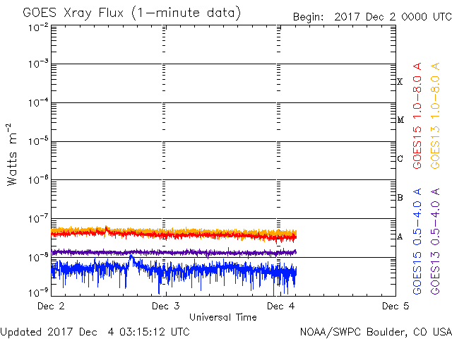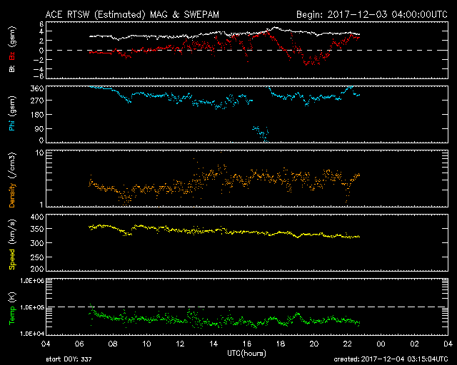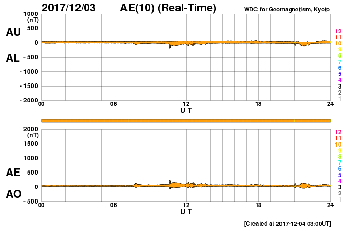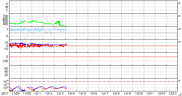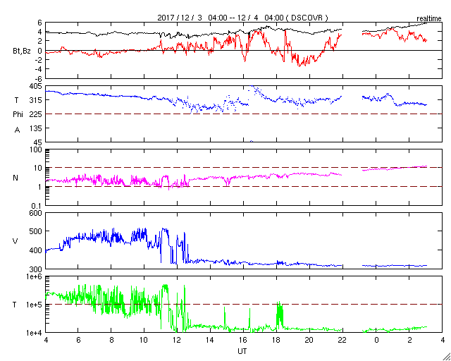 2017/12/ 4 12:11 更新 太陽風は低速です。これから高速の太陽風が始まりそうです。 担当 篠原 太陽風は、速度が320km/秒へ下がり、 低速の風になっています。 DSCOVR衛星のグラフを見ると、 昨夜までは400km/秒台を超える速度になっていましたが、 その後、一気に300km/秒台前半に下がっています。 しかし、ACE衛星のデータと見比べると、 DSCOVR衛星のグラフの前半の400km/秒台は、 データエラーだった可能性があり、 この頃から既に、 太陽風は300km/秒台の低速風になっていた様に思います。 27日周期の図を見ると、前周期と同様の推移をしています。 このまま進むと、これからコロナホールの影響が到来しそうです。 現在の太陽風の磁場強度は、4nTから6nTへ少し上がりかけています。 この後も更に上昇するようであれば、太陽風の乱れの始まりです。 引き続き変化に注目して下さい。 磁気圏は静かな状態が続いています。 AE指数のグラフは、ほとんど変化がありません。 太陽は無黒点で、静かな状態が続いています。