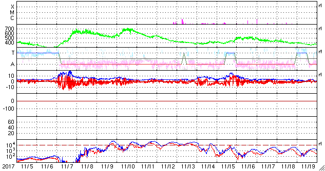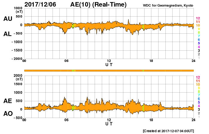 下段のAEグラフの値が高くなると、オーロラ活動が活発化しています。