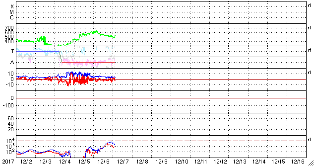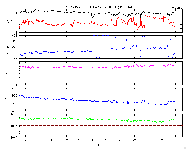 2017/12/ 5 11:43 太陽風の磁場強度が強まり、コロナホールの影響が及び始めた様です。