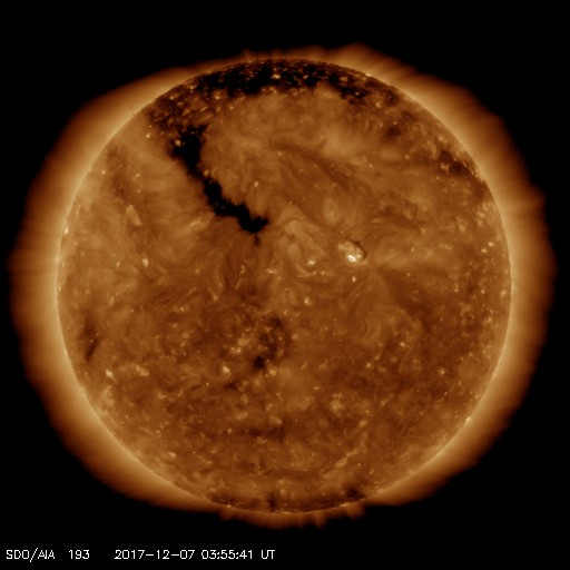 北極付近から低緯度に細長く伸びるコロナホールの先端が、