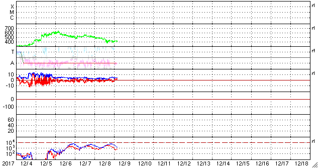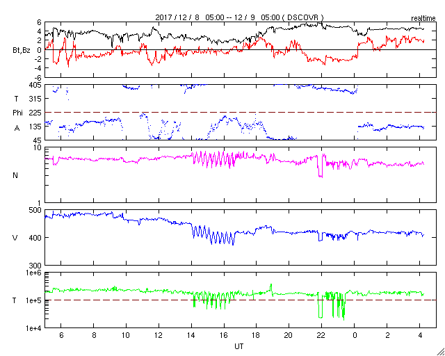 2017/12/ 5 11:43 太陽風の磁場強度が強まり、コロナホールの影響が及び始めた様です。