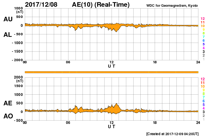 下段のAEグラフの値が高くなると、オーロラ活動が活発化しています。