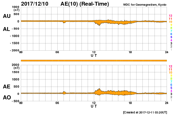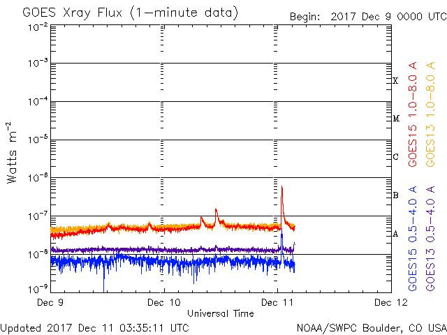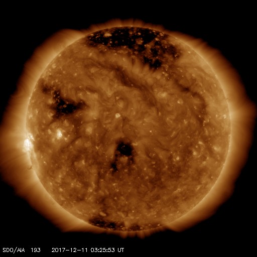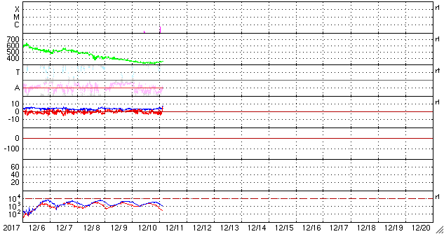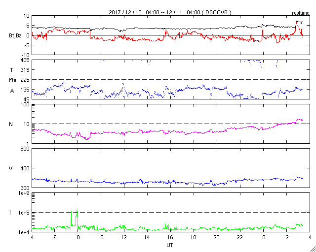 2017/12/11 12:31 更新 太陽の東端から黒点が現れるかもしれません。太陽風は低速です。 担当 篠原 太陽の東側に現れた黒点は、 2461黒点群と番号が付けられ、 小さい姿のまま今日も見えています。 一方、東端には新しい活動領域が近づき、 可視光写真では、白斑が見える様になっています。 今朝、11日10時(世界時11日1時)頃には、 B6程度の小さいフレアを起こしています。 今後、黒点も姿を現すでしょうか。 太陽風は、330〜340km/秒と低速の風が続いています。 磁場強度は、4nTで安定していたのですが、 グラフの最後に、7nTへの小さい高まりが起きています。 磁場の南北成分は、弱い南寄りの傾向が続き、 磁気圏は基本的には穏やかですが、 AE指数は、200nTの小さい活動が続く時間帯も見られます。 SDO衛星AIA193では、北半球のコロナホールが西に進み、 そろそろ影響が見られるかもしれません。 27日周期の図を見ると、 前周期に速度の弱い高まりがやって来たのは、 2日ほど遅れて、11月16日でした。 今回は、12月13日に相当します。 ![]() SDO衛星のAIA193カメラによる太陽コロナの様子 (c) SDO (NASA) ![]() SDO衛星による太陽の可視光写真。マウスの矢印を写真に重ねると、黒点番号付きの写真に切り替わります。 (c) SDO (NASA) ![]() GOES衛星の太陽X線データ (c) NOAA/SWPC ![]() DSCOVRが観測した太陽風の磁場(1番上の枠、黒線は全体の強度、赤線は南北成分) および、太陽風の密度(3番目の紫線)、速度(4番目の青線) (c) データ:NOAA/SWPC、作図:宇宙天気ニュース ![]() AE指数(速報値) 下段のAEグラフの値が高くなると、オーロラ活動が活発化しています。 (c) 京都大学WDC ![]() ![]() 27日の太陽周期に合わせたデータプロット 太陽が同じ面を地球に向けていた27日前の変化から、今後を予想することができます。 (c) 作図:宇宙天気ニュース