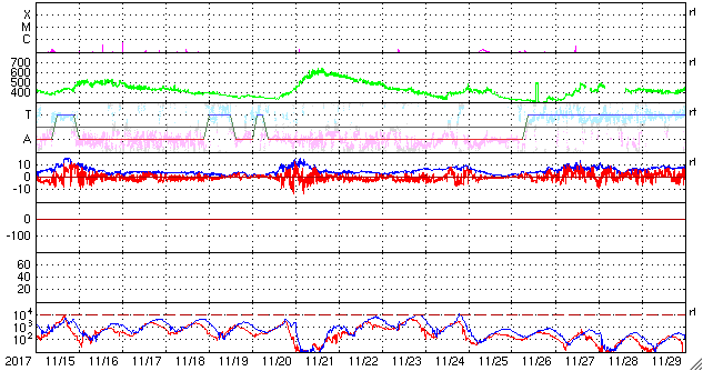 (c) SDO (NASA) ![]() SDO衛星による太陽の可視光写真 (c) SDO (NASA) ![]() DSCOVRが観測した太陽風の磁場(1番上の枠、黒線は全体の強度、赤線は南北成分) および、太陽風の密度(3番目の紫線)、速度(4番目の青線) (c) データ:NOAA/SWPC、作図:宇宙天気ニュース ![]() AE指数(速報値) 下段のAEグラフの値が高くなると、オーロラ活動が活発化しています。 (c) 京都大学WDC ![]() ![]() 27日の太陽周期に合わせたデータプロット 太陽が同じ面を地球に向けていた27日前の変化から、今後を予想することができます。 (c) 作図:宇宙天気ニュース