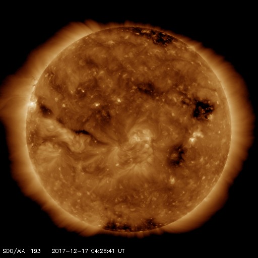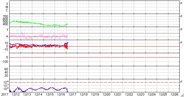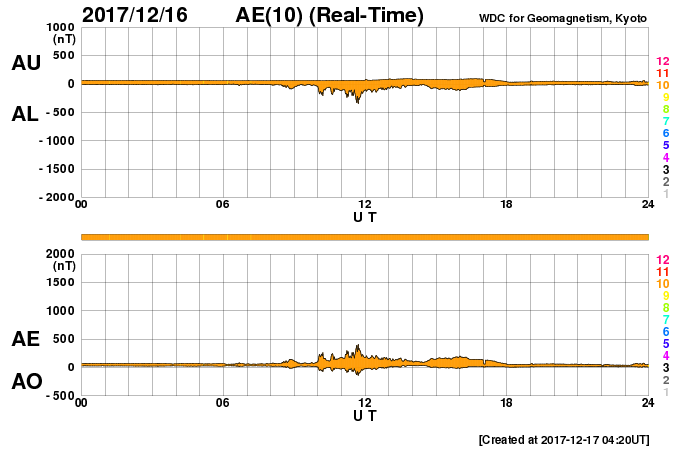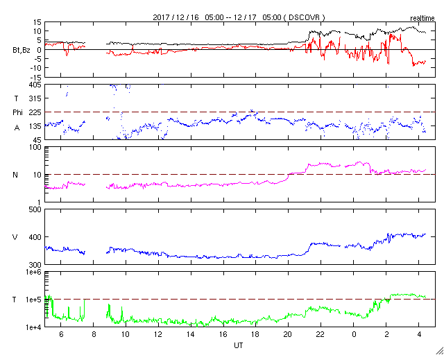 2017/12/17 13:36 更新 太陽風の磁場が強まり、速度も高まり始めています。 担当 篠原 太陽風の強まりがやって来た様です。 今朝、17日6時(世界時16日21時)に、 太陽風の磁場強度は、3nTから10nT近くへ強まり、 速度も、330km/秒から370km/秒へ少し上昇しました。 その後も、磁場強度は10nT前後に強まった状態が続き、 速度も400km/秒と平均的な速さに戻っています。 27日周期の図を参照すると、 前周期の11月20日に発生した変化が、 半日ほど早まって回帰したと思われます。 前周期の太陽風は、速度が600km/秒まで高まりました。 今回はどのような推移になるでしょうか。 磁場が強まった後、 磁場の南北成分は南向きに-5nTを超える変化が目立っています。 まだ速度が遅いためか、AE指数では、目立った変化にはなっていませんが、 今後、速度が上昇して、磁場も南寄りに変化が続くと、 オーロラの活動も高まってくるでしょう。 太陽は、無黒点の状態が続いています。 東端の活動的な領域は、こちら側に回ってきましたが、 黒点はありませんでした。
