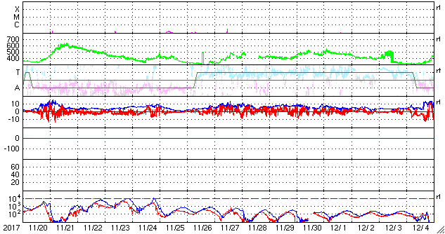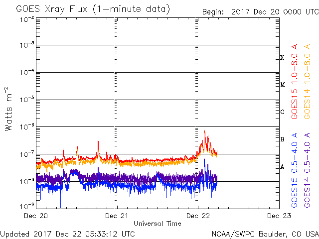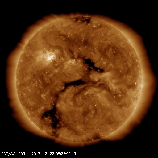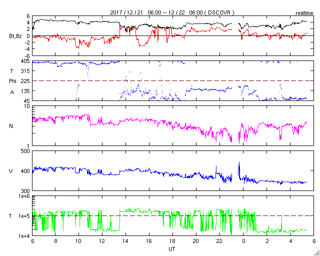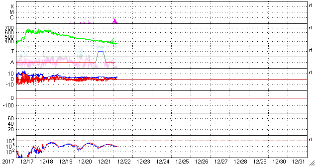 2017/12/22 14:34 更新 2692黒点群は、少し大きくなっています。太陽風は低速です。 担当 篠原 2692黒点群がやや大きくなり、 活動もやや高まっています。 X線グラフを見ると、今朝に入って全体の強度が上がり、 Bクラスの小さいフレアを繰り返しています。 今後、更に高まって、 Cクラスに達する変化を起こすでしょうか。 Cに達する規模の活動は、 10月20日(日本時間21日)のM1.1フレアを最後に、 2か月にわたって発生していません。 久しぶりの発生になるでしょうか。 太陽風は、速度が340km/秒に下がり、 低速の風に変わっています。 磁場強度は、3〜4nTで安定しています。 磁気圏は静穏で、AE指数はほとんど変化がありません。 27日周期の図を見ると、 前周期も11月25〜26日は低速になっていて、 今回も同様の推移です。 一方、SDO衛星AIA193では、 赤道域のコロナホールが西に進み、 明後日くらいから、影響が始まる可能性があります。