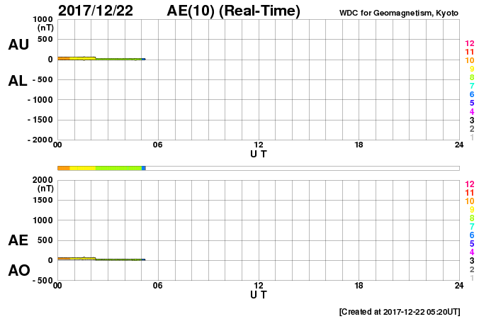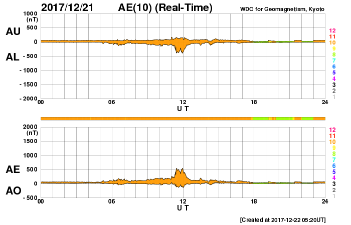 (c) SDO (NASA) ![]() SDO衛星による太陽の可視光写真。マウスの矢印を写真に重ねると、黒点番号付きの写真に切り替わります。 (c) SDO (NASA) ![]() GOES衛星の太陽X線データ (c) NOAA/SWPC ![]() DSCOVRが観測した太陽風の磁場(1番上の枠、黒線は全体の強度、赤線は南北成分) および、太陽風の密度(3番目の紫線)、速度(4番目の青線) (c) データ:NOAA/SWPC、作図:宇宙天気ニュース ![]() AE指数(速報値) 下段のAEグラフの値が高くなると、オーロラ活動が活発化しています。 (c) 京都大学WDC ![]() ![]() 27日の太陽周期に合わせたデータプロット 太陽が同じ面を地球に向けていた27日前の変化から、今後を予想することができます。 (c) 作図:宇宙天気ニュース