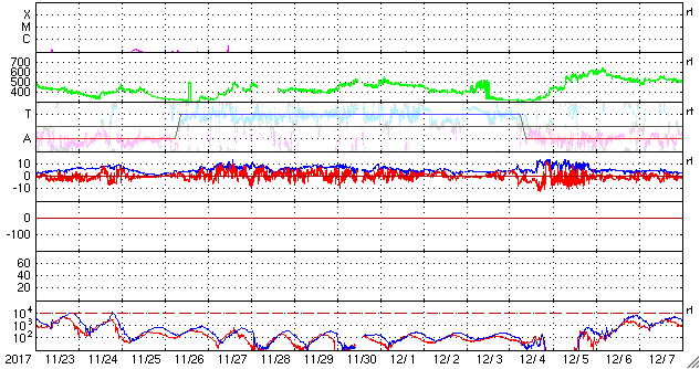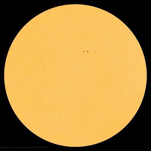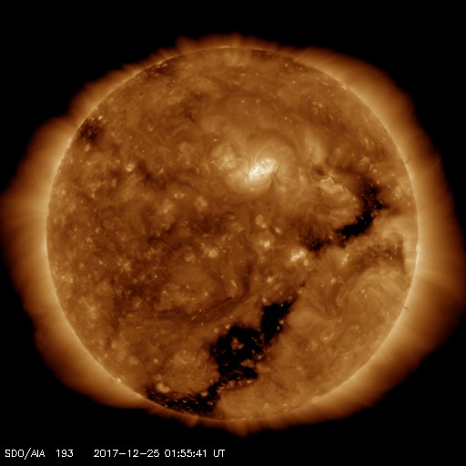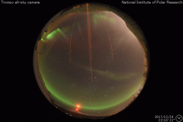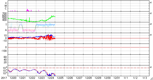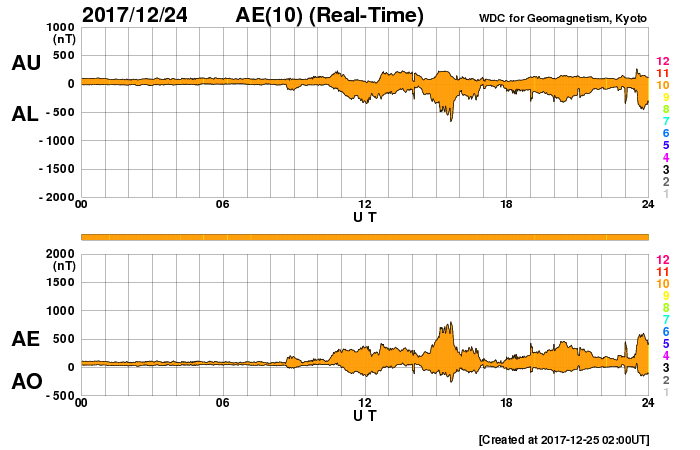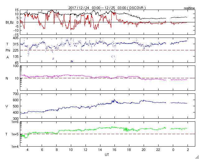 2017/12/25 11:01 更新 高速の太陽風が到来し、550km/秒に高まっています。 担当 篠原 昨日のニュース以降、太陽風の速度はゆっくりと上昇を続け、 昨夜、24日22時(世界時24日13時)には、 500km/秒を超えて高速風になりました。 速度は更に上昇して、今朝、25日5時(世界時24日20時)には、 580km/秒まで高まりました。 その後は少し下げて、現在は550km/秒です。 27日周期の図を見ると、 前周期の太陽風は、500km/秒に達する程度の変化でしたが、 今回はそれを上回る速さに達しています。 10〜15nTに強まっていた太陽風の磁場強度は、 速度が最高速に達すると下がり始め、 現在は5nTと平均的な値に戻っています。 高速太陽風は中盤を迎えている様です。 太陽風磁場の南北成分は、 速度が高まる頃に南北に変化を繰り返しました。 この影響で磁気圏の活動もある程度高まり、 AE指数は、300〜800nTと中規模の変化が続きました。 この中で、世界時24日23時前後のオーロラの活動を、 ノルウェー・トロムソの全天カメラの動画で紹介します。 美しいオーロラの光が空を飾っています。 磁場の南北成分は、 その後は0nT付近に留まる様に傾向が変わっています。 磁気圏の活動も、この状態が続くと比較的穏やかになりそうです。 SDO衛星AIA193の太陽コロナ写真を見ると、 コロナホールは太陽の南半球に伸びて、 現在、中緯度付近のコロナホールが太陽の中心線付近に広がっています。 この領域の影響が地球にやって来るのが3日後程度と考えると、 太陽風の高まりは、更に4〜5日程度続く可能性があります。 27日周期の図では、前周期は500km/秒に達する程度の変化が、 11月30日〜12月1日にかけて到来しています。 今週期は、12月27〜28日に相当します。 太陽は、2692黒点群が見えていますが、 特に活動はなく、穏やかです。 ![]() ノルウェー・トロムソの全天カメラで、世界時24日22時〜25日0時頃に撮影されたオーロラ。 (c) 国立極地研究所、(動画加工 : 宇宙天気ニュース) ![]() SDO衛星のAIA193カメラによる太陽コロナの様子 (c) SDO (NASA) ![]() SDO衛星による太陽の可視光写真。マウスの矢印を写真に重ねると、黒点番号付きの写真に切り替わります。 (c) SDO (NASA) ![]() DSCOVRが観測した太陽風の磁場(1番上の枠、黒線は全体の強度、赤線は南北成分) および、太陽風の密度(3番目の紫線)、速度(4番目の青線) (c) データ:NOAA/SWPC、作図:宇宙天気ニュース ![]() AE指数(速報値) 下段のAEグラフの値が高くなると、オーロラ活動が活発化しています。 (c) 京都大学WDC ![]() ![]() 27日の太陽周期に合わせたデータプロット 太陽が同じ面を地球に向けていた27日前の変化から、今後を予想することができます。 (c) 作図:宇宙天気ニュース