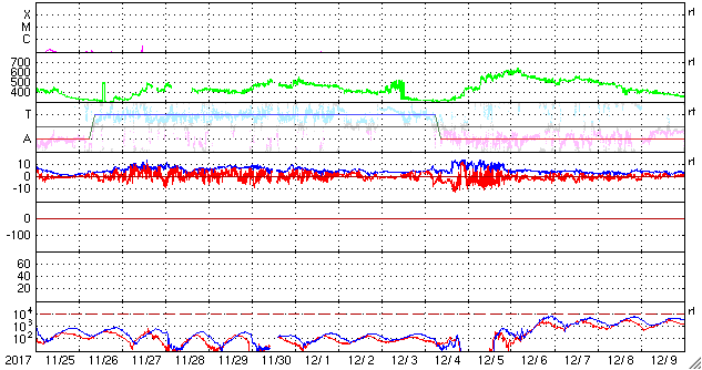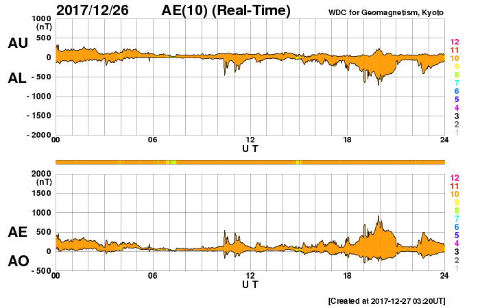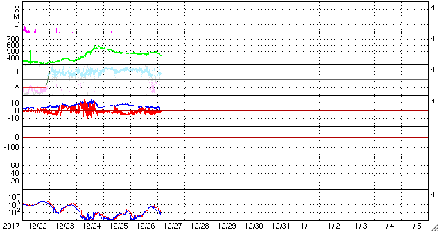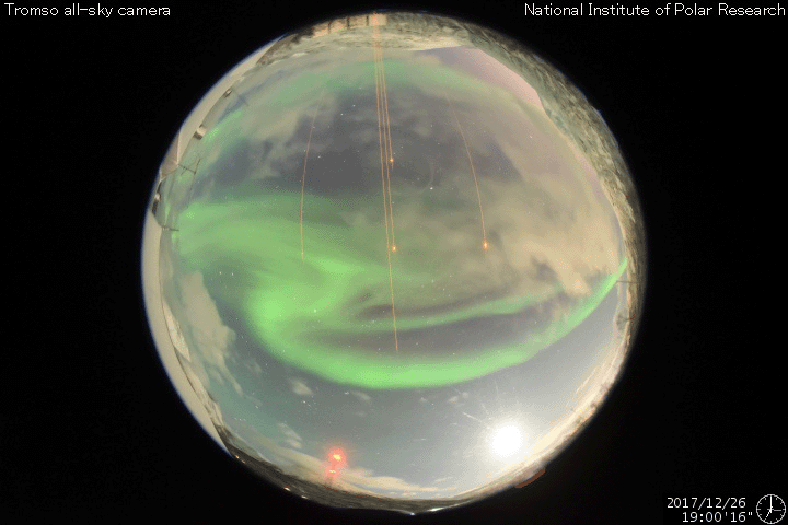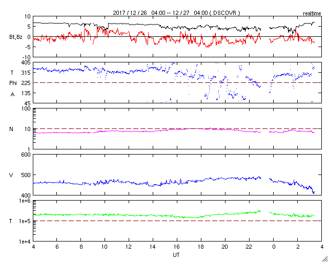 2017/12/27 12:40 更新 太陽風は平均的な速度に戻っています。2692黒点群が見えなくなりそうです。 担当 篠原 太陽風の速度は、 今朝にかけて480km/秒へやや高まりましたが、 すぐに下がって、現在は420km/秒と平均的な状態に戻っています。 磁場強度は、5nT前後で安定しています。 27日周期の図を見ると、 前周期は、11月30〜31日にかけて 太陽風速度の弱い高まりが来ましたが、 今回はどうなるでしょうか。 太陽風磁場の南北成分は、南寄りの傾向が続き、 磁気圏の活動もやや高まった状態が続いています。 3日連続になりますが、 ノルウェー・トロムソの全天カメラの動画を掲載します。 世界時26日19〜20時頃、 AE指数で900nTの変化になっている時のオーロラです。 短い時間で一気に空全体を覆う様子が見事です。 太陽では、2692黒点群が小さくなり、 掲載の写真では、かろうじて見えている程度です。 このまま消えてしまいそうです。